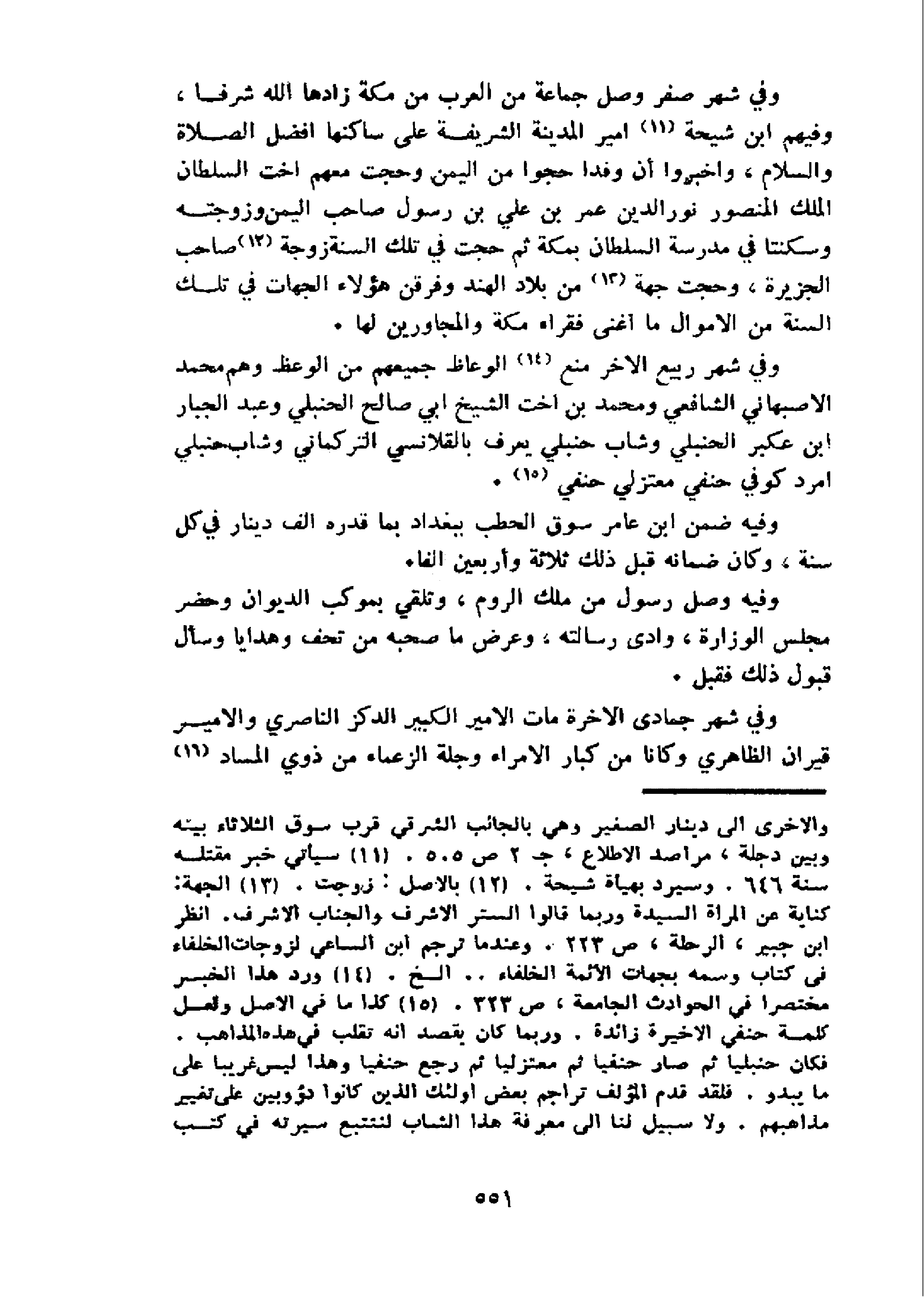 وفي شهر صفر وصل جماعة من العرب من مكة زادها الله شرفا، وفيهم ابن شيحة 11 امير المدينة الشريفة على ساكنها افضل الصلاة والسلام، وأخبروا أن وفدا حجوا من اليمن وحجت معهم اخت السلطان الملك المنصور نور الدين عمر بن علي بن رسول صاحب اليمن وزوجته وسكنتا في مدرسة السلطان بمكة ثم حجت في تلك السنة زوجة 12 صاحب الجزيرة، وحجت جهة 13 من بلاد الهند وفرقن هؤلاء الجهات في تلك السنة من الاموال ما أغنى فقراء مكة والمجاورين لها.