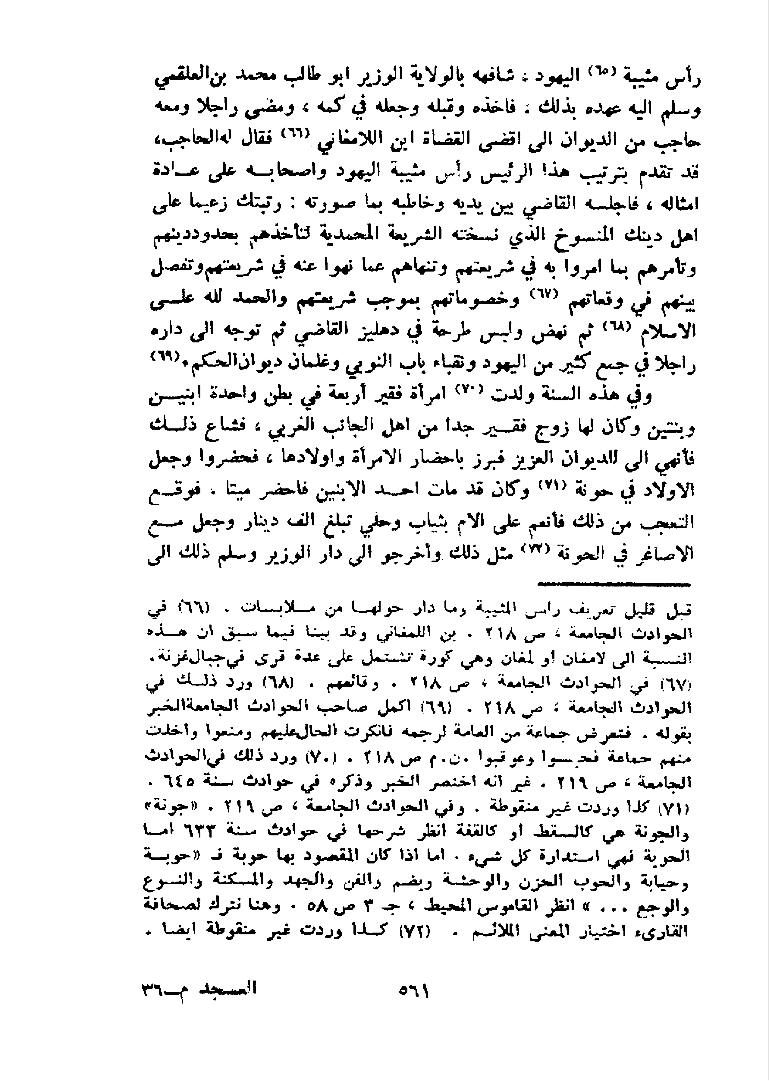 رأس مثيبة 65 اليهود، شافهه بالولاية الوزير ابو طالب محمد بن العلقمي وسلم اليه عهده بذلك، فاخذه وقبله وجعله في كمه، ومضى راجلا ومعه حاجب من الديوان الى اقضى القضاة ابن اللامغاني 66 فقال له الحاجب، قد تقدم بترتيب هذا الرئيس رأس مثيبة اليهود واصحابه على عادة امثاله، فاجلسه القاضي بين يديه وخاطبه بما صورته: رتبتك زعيما على اهل دينك المنسوخ الذي نسخته الشريعة المحمدية لتأخذهم بحدود دينهم وتأمرهم بما امروا به في شريعتهم وتنهاهم عما نهوا عنه في شريعتهم وتفصل بينهم في وقعاتهم 67 و خصوماتهم بموجب شريعتهم والحمد لله على الاسلام 68 ثم نهض ولبس طرحة في دهليز القاضي ثم توجه الى داره راجلا في جمع كثير من اليهود ونقباء باب النوبي وغلمان ديوان الحكم. 69