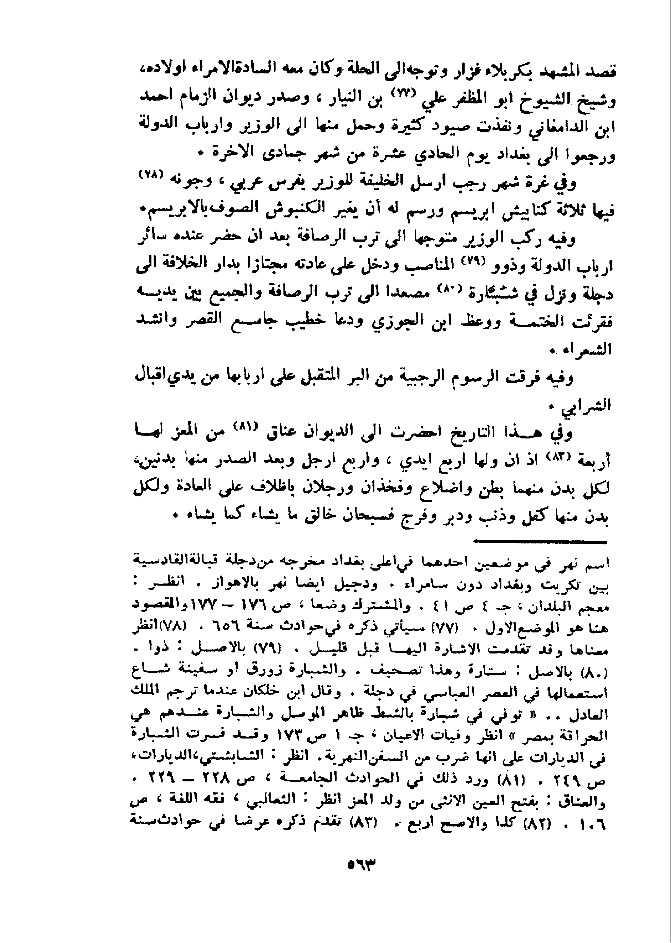 و فيه ركب الوزير متوجها الى ترب الرصافة بعد ان حضر عنده سائر ارباب الدولة وذوو 79 المناصب ودخل على عادته مجتازا بدار الخلافة الى دجلة ونزل في شبّارة 80 مصعدا الى ترب الرصافة والجميع بين يديه فقرئت الختمة ووعظ ابن الجوزي ودعا خطيب جامع القصر وانشد الشعراء.