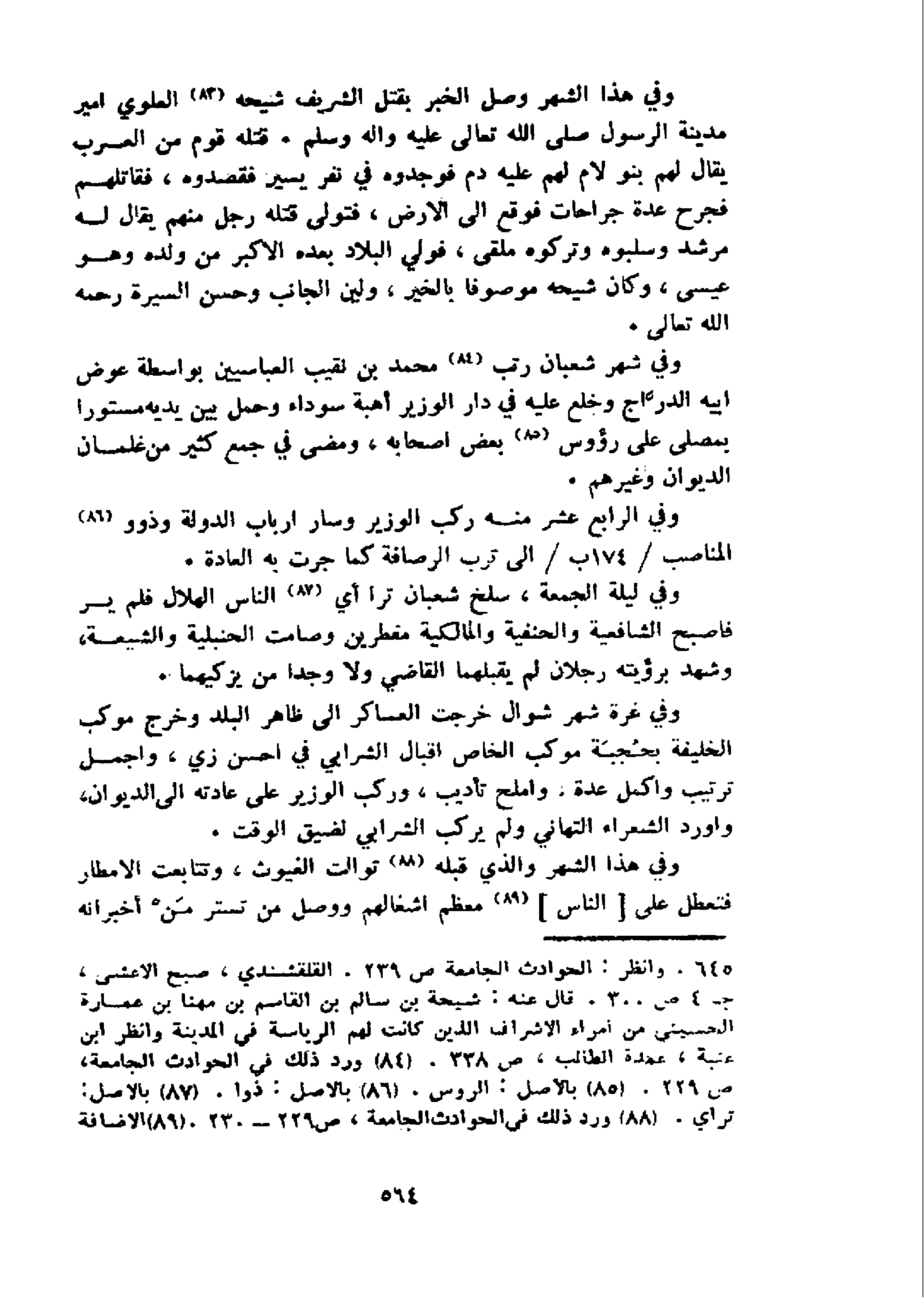 و في هذا الشهر وصل الخبر بقتل الشريف شيحه 83 العلوي امير مدينة الرسول صلى الله تعالى عليه واله وسلم. قتله قوم من العرب يقال لهم بنو لام لهم عليه دم فوجدوه في نفر يسير فقصدوه، فقاتلهم فجرح عدة جراحات فوقع الى الارض، فتولى قتله رجل منهم يقال له مرشد وسلبوه وتركوه ملقى، فولي البلاد بعده الاكبر من ولده وهو عيسى، وكان شيحه موصوفا بالخير، ولين الجانب وحسن السيرة رحمه الله تعالى.