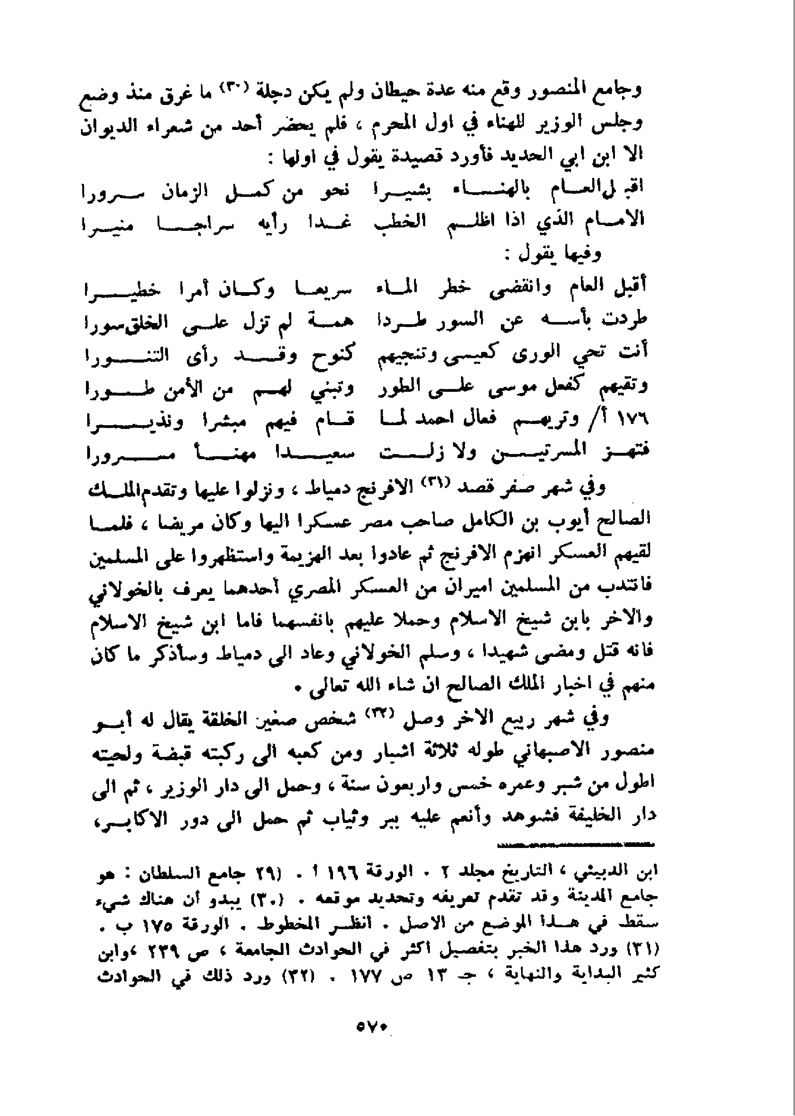 و جامع المنصور وقع منه عدة حيطان ولم يكن دجلة 30 ما غرق منذ وضع وجلس الوزير للهناء في اول المحرم، فلم يحضر أحد من شعراء الديوان الا ابن ابي الحديد فأورد قصيدة يقول في اولها: