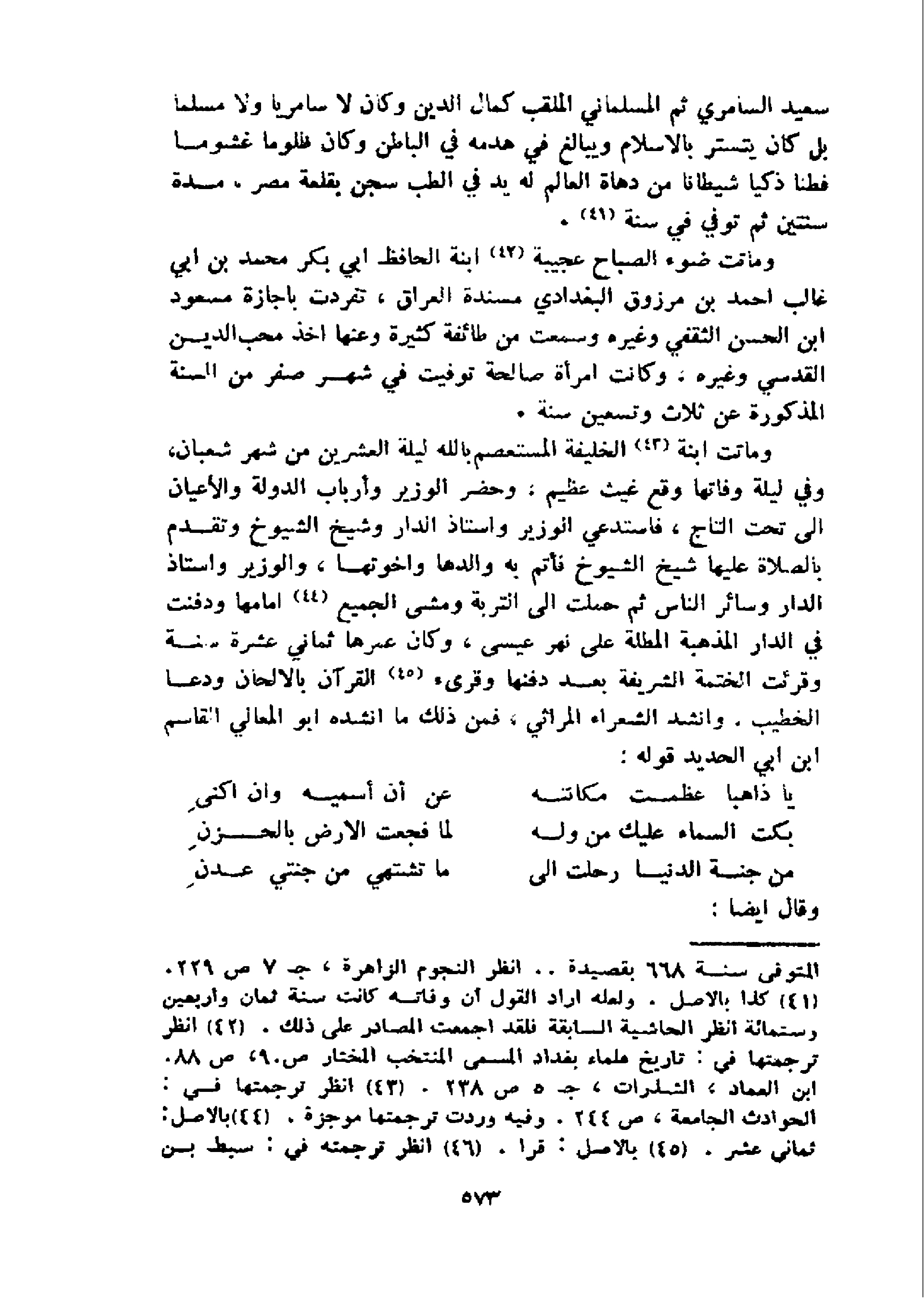 و ماتت ابنة 43 الخليفة المستعصم بالله ليلة العشرين من شهر شعبان، وفي ليلة وفاتها وقع غيث عظيم، وحضر الوزير وأرباب الدولة والأعيان الى تحت التاج، فاستدعي الوزير واستاذ الدار وشيخ الشيوخ وتقدم بالصلاة عليها شيخ الشيوخ فأتم به والدها واخوتها، والوزير واستاذ الدار وسائر الناس ثم حملت الى التربة ومشى الجميع 44 امامها ودفنت في الدار المذهبة المطلة على نهر عيسى، وكان عمرها ثماني عشرة سنة وقرئت الختمة الشريفة بعد دفنها وقرى ء 45 القرآن بالالحان ودعا الخطيب. وانشد الشعراء المراثي، فمن ذلك ما انشده ابو المعالي القاسم ابن ابي الحديد قوله: