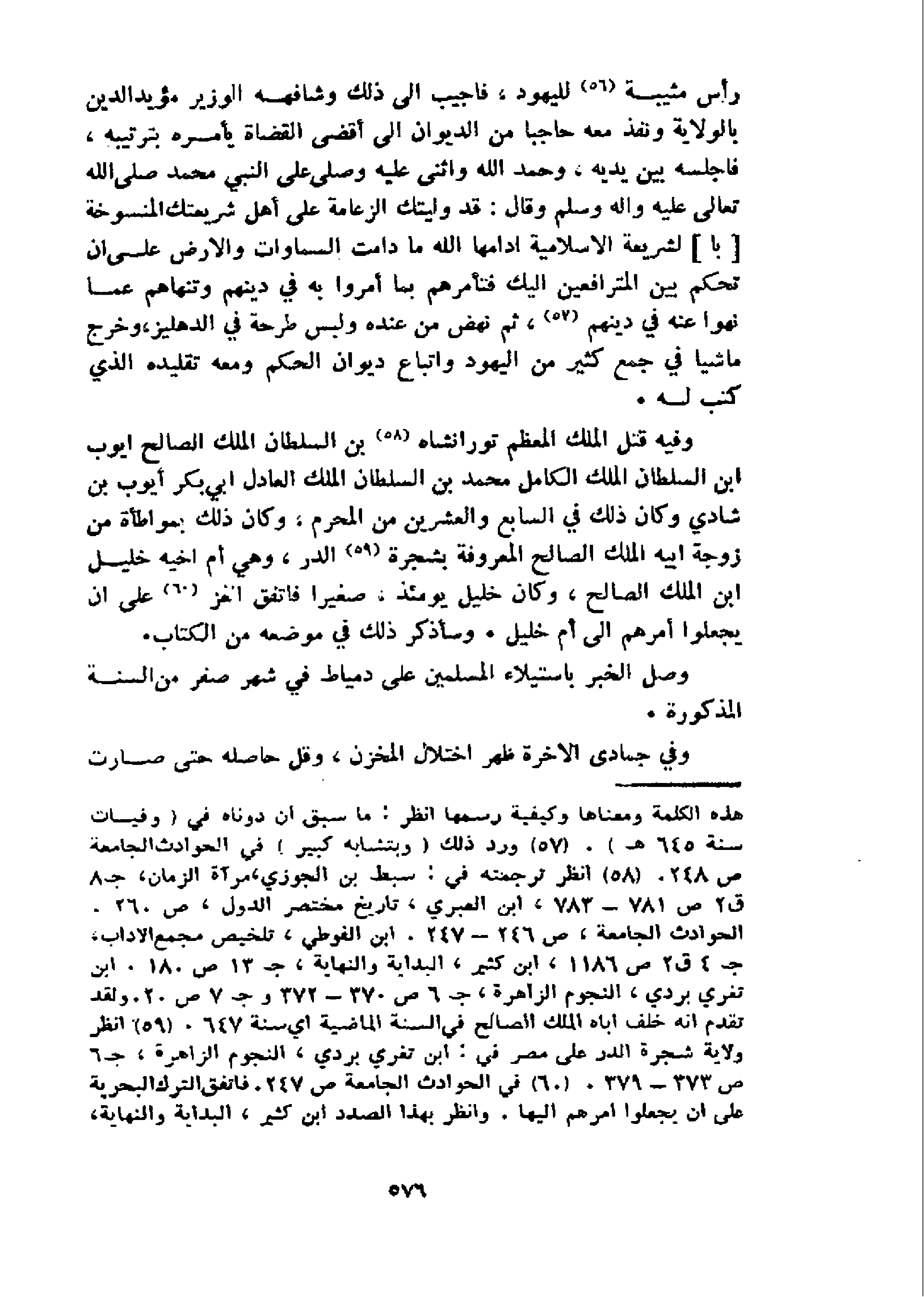 و فيه قتل الملك المعظم تورانشاه 58 بن السلطان الملك الصالح ايوب ابن السلطان الملك الكامل محمد بن السلطان الملك العادل ابي بكر أيوب بن شادي وكان ذلك في السابع والعشرين من المحرم، وكان ذلك بمواطأة من زوجة ابيه الملك الصالح المعروفة بشجرة 59 الدر، وهي أم اخيه خليل ابن الملك الصالح، وكان خليل يومئذ، صغيرا فاتفق الغز 60 على ان يجعلوا أمرهم الى أم خليل. وسأذكر ذلك في موضعه من الكتاب.