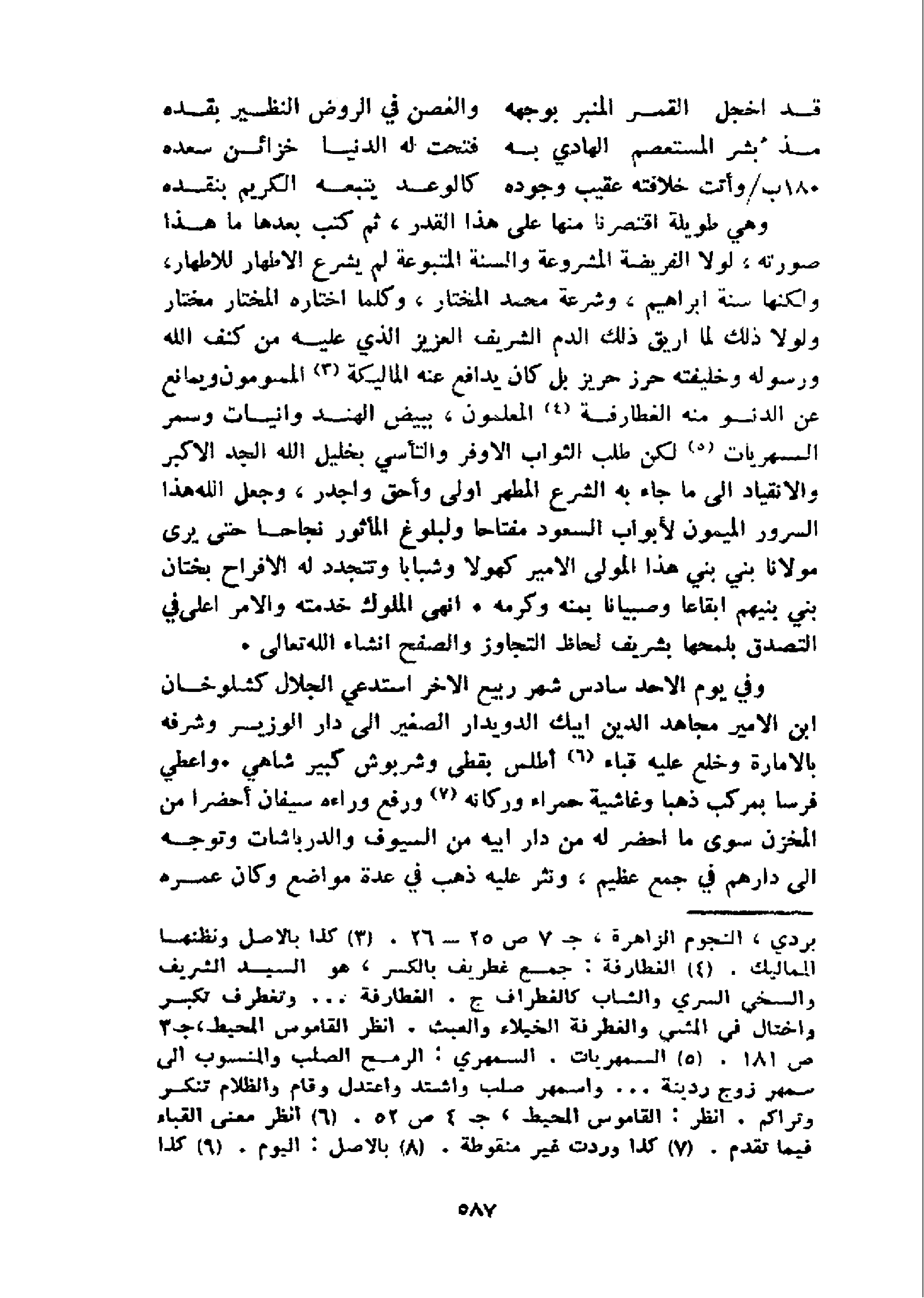 قد اخجل القمر المنبر بوجههو الغصن في الروض النظير بقده مذ بشر المستعصم الهادي بهفتحت له الدنيا خزائن سعده 180 ب/و أتت خلافته عقيب وجودهكالوعد يتبعه الكريم بنقده وهي طويلة اقتصرنا منها على هذا القدر، ثم كتب بعدها ما هذا صورته، لو لا الفريضة المشروعة والسنة المتبوعة لم يشرع الاطهار للاطهار، ولكنها سنة ابراهيم، وشرعة محمد المختار، وكلما اختاره المختار مختار ولو لا ذلك لما اريق ذلك الدم الشريف العزيز الذي عليه من كنف الله ورسوله وخليفته حرز حريز بل كان يدافع عنه الماليكة 3 المسومون ويمانع عن الدنو منه الغطارفة 4 المعلمون، ببيض الهند وانيات وسمر السمهريات 5 لكن طلب الثواب الاوفر والتأسي بخليل الله الجد الاكبر والانقياد الى ما جاء به الشرع المطهر اولى وأحق واجدر، وجعل الله هذا السرور الميمون لأبواب السعود مفتاحا ولبلوغ المأثور نجاحا حتى يرى مولانا بني بني هذا المولى الامير كهولا وشبابا وتتجدد له الافراح بختان بني بنيهم ابقاعا وصبيانا بمنه وكرمه. انهى الملوك خدمته والامر اعلى في التصدق بلمحها بشريف لحاظ التجاوز والصفح انشاء الله تعالى.