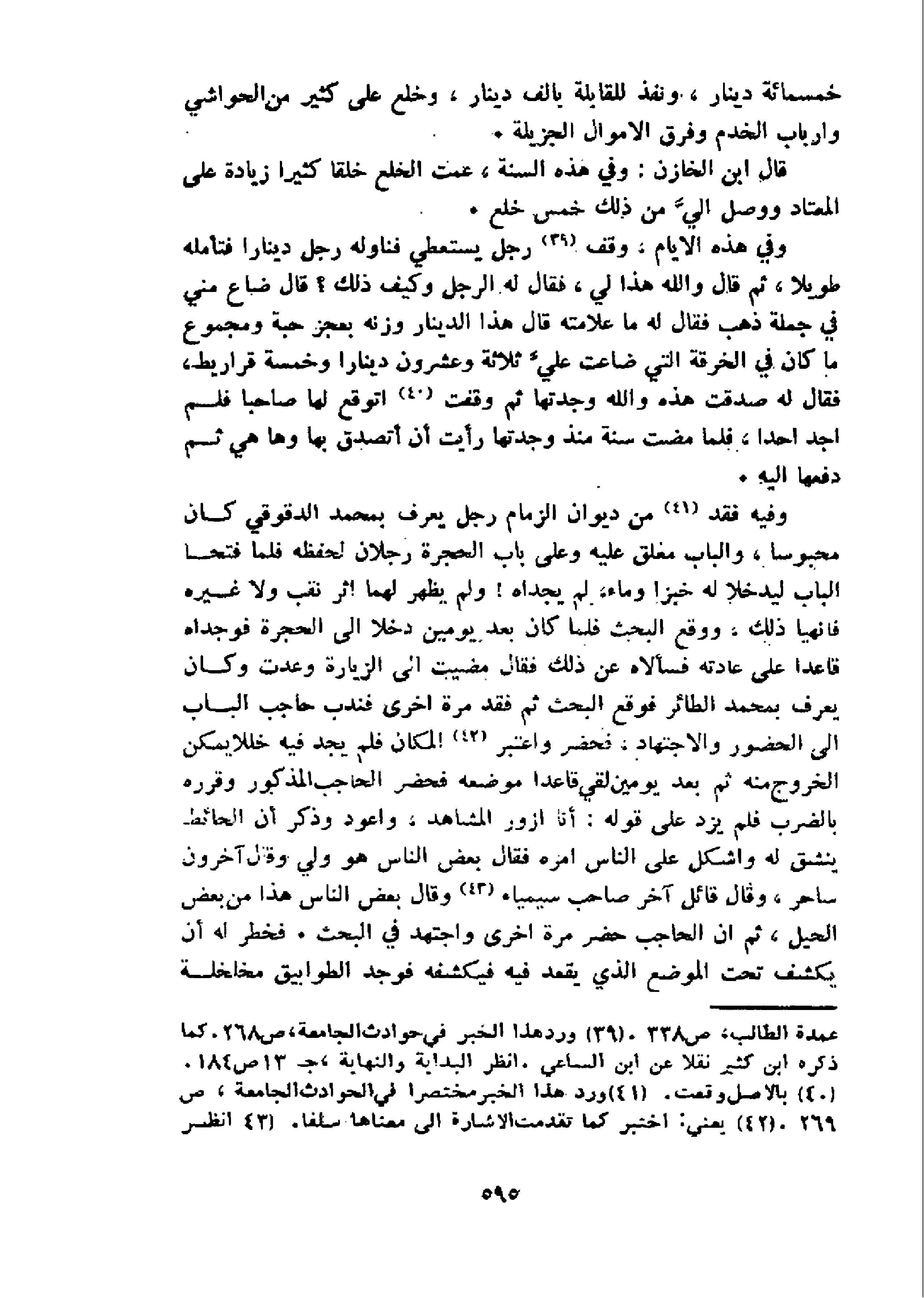 و في هذه الايام، وقف 39 رجل يستعطي فناوله رجل دينارا فتأمله طويلا، ثم قال والله هذا لي، فقال له الرجل وكيف ذلك؟ قال ضاع مني في جملة ذهب فقال له ما علامته قال هذا الدينار وزنه بعجز حبة ومجموع ما كان في الخرقة التي ضاعت عليّ ثلاثة وعشرون دينارا وخمسة قراريط، فقال له صدقت هذه والله وجدتها ثم وقفت 40 اتوقع لها صاحبا فلم اجد احدا، فلما مضت سنة منذ وجدتها رأيت أن أتصدق بها وها هي ثم دفعها اليه.