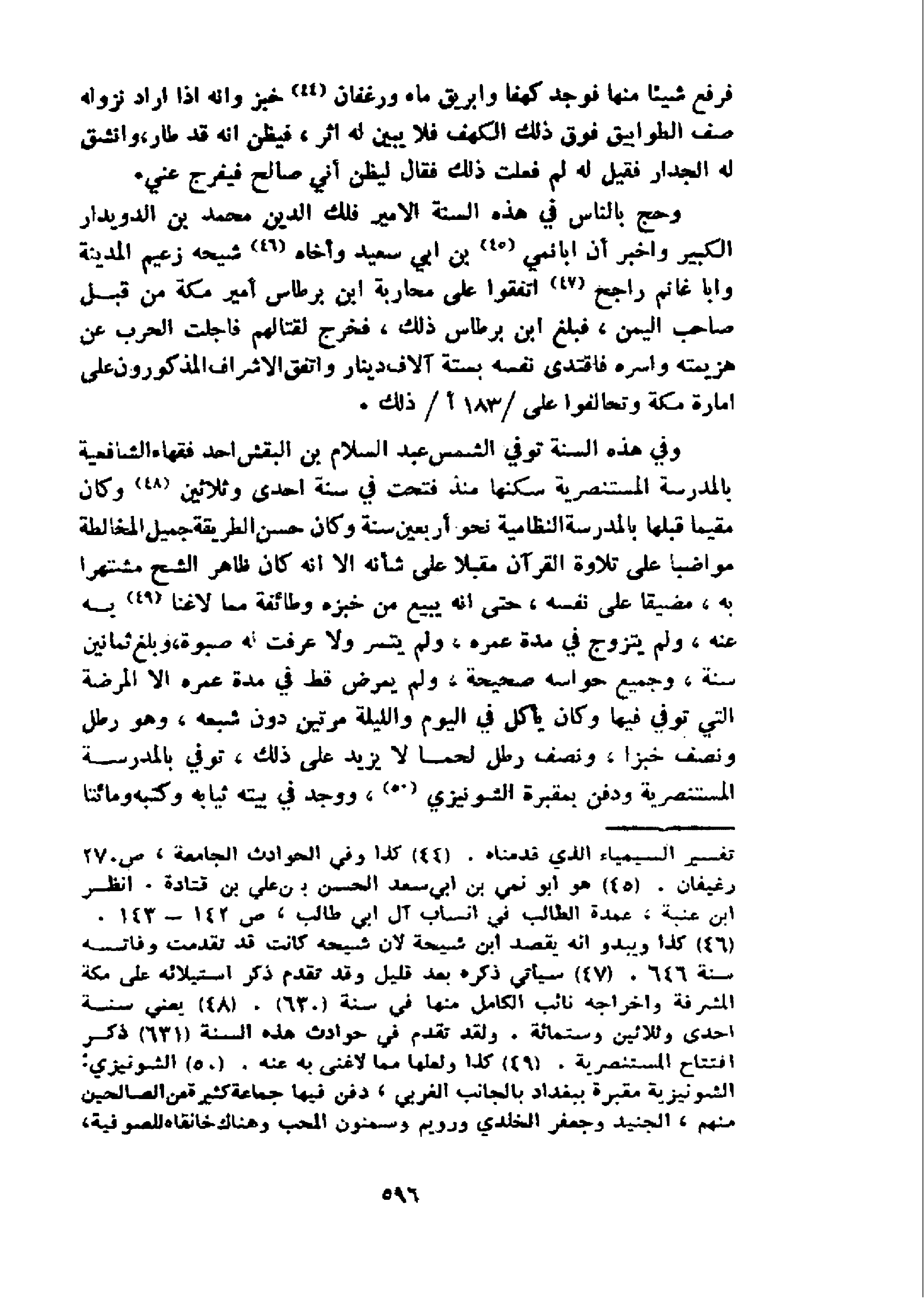 و في هذه السنة توفي الشمس عبد السلام بن البقش احد فقهاء الشافعية بالمدرسة المستنصرية سكنها منذ فتحت في سنة احدى وثلاثين 48 و كان مقيما قبلها بالمدرسة النظامية نحو أربعين سنة وكان حسن الطريقة جميل المخالطة مواضبا على تلاوة القرآن مقبلا على شأنه الا انه كان ظاهر الشح مشتهرا به، مضيقا على نفسه، حتى انه يبيع من خبزه وطائفة مما لاغنا 49 به عنه، ولم يتزوج في مدة عمره، ولم يتسر ولا عرفت له صبوة، وبلغ ثمانين سنة، وجميع حواسه صحيحة، ولم يمرض قط في مدة عمره الا المرضة التي توفي فيها وكان يأكل في اليوم والليلة مرتين دون شبعه، وهو رطل ونصف خبزا، ونصف رطل لحما لا يزيد على ذلك، توفي بالمدرسة المستنصرية ودفن بمقبرة الشونيزي 50، و وجد في بيته ثيابه وكتبه ومائتا