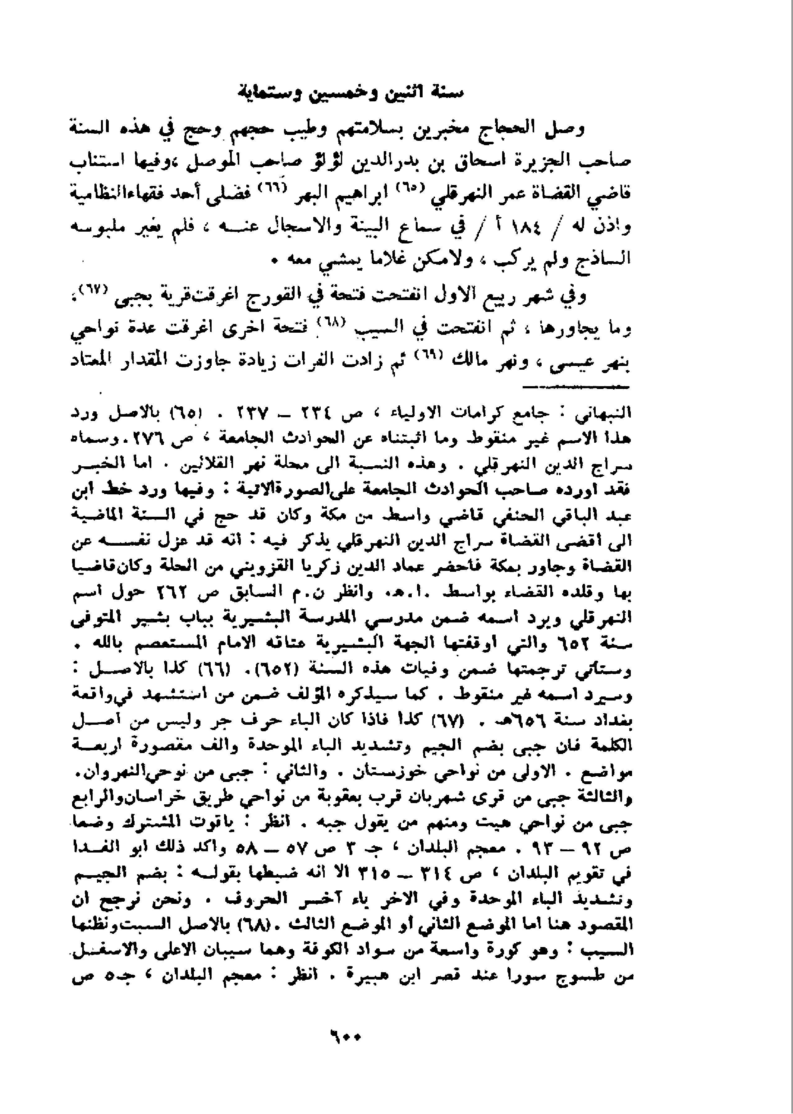 وصل الحجاج مخبرين بسلامتهم وطيب حجهم وحج في هذه السنة صاحب الجزيرة اسحاق بن بدر الدين لؤلؤ صاحب الموصل، وفيها استناب قاضي القضاة عمر النهرقلي 65 ابراهيم البهر 66 فضلى أحد فقهاء النظامية واذن له 184 / أ/في سماع البينة والاسجال عنه، فلم يغير ملبوسه الساذج ولم يركب، ولامكن غلاما يمشي معه.