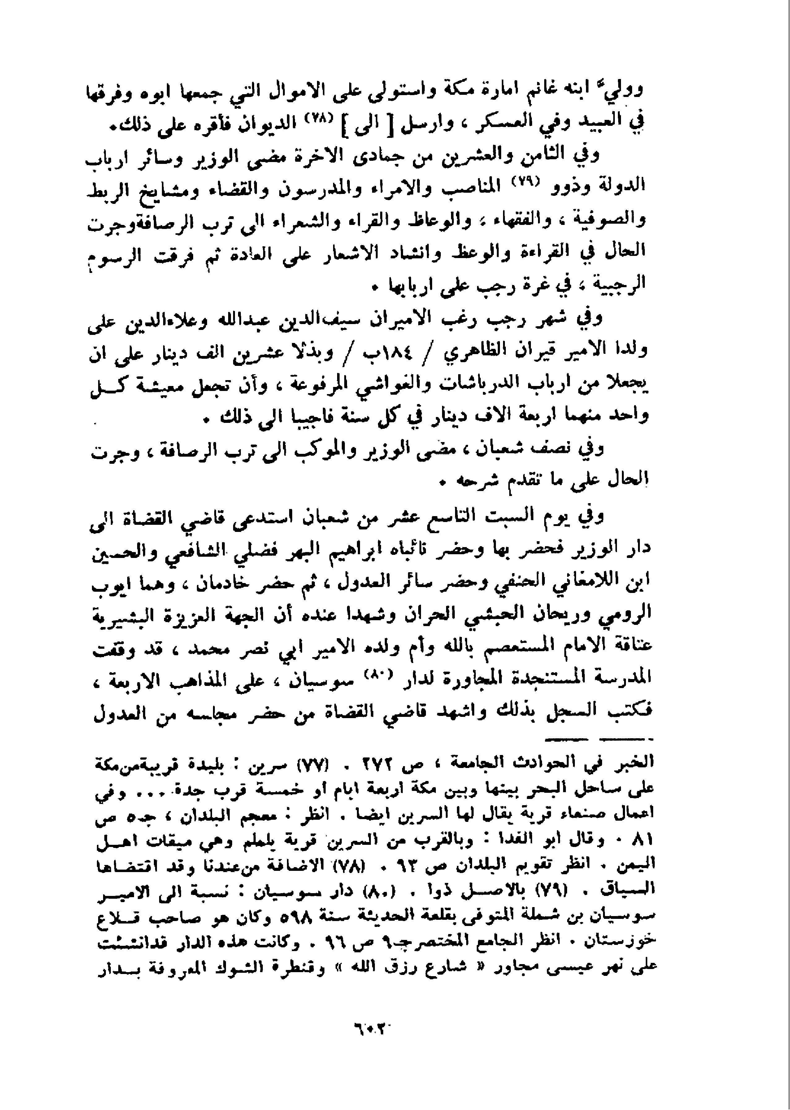 و في يوم السبت التاسع عشر من شعبان استدعى قاضي القضاة الى دار الوزير فحضر بها وحضر نائباه ابراهيم البهر فضلي الشافعي والحسين ابن اللامغاني الحنفي وحضر سائر العدول، ثم حضر خادمان، وهما ايوب الرومي وريحان الحبشي الحران وشهدا عنده أن الجهة العزيزة البشيرية عتاقة الامام المستعصم بالله وأم ولده الامير ابي نصر محمد، قد وقفت المدرسة المستنجدة المجاورة لدار 80 سوسيان، على المذاهب الاربعة، فكتب السجل بذلك واشهد قاضي القضاة من حضر مجلسه من العدول