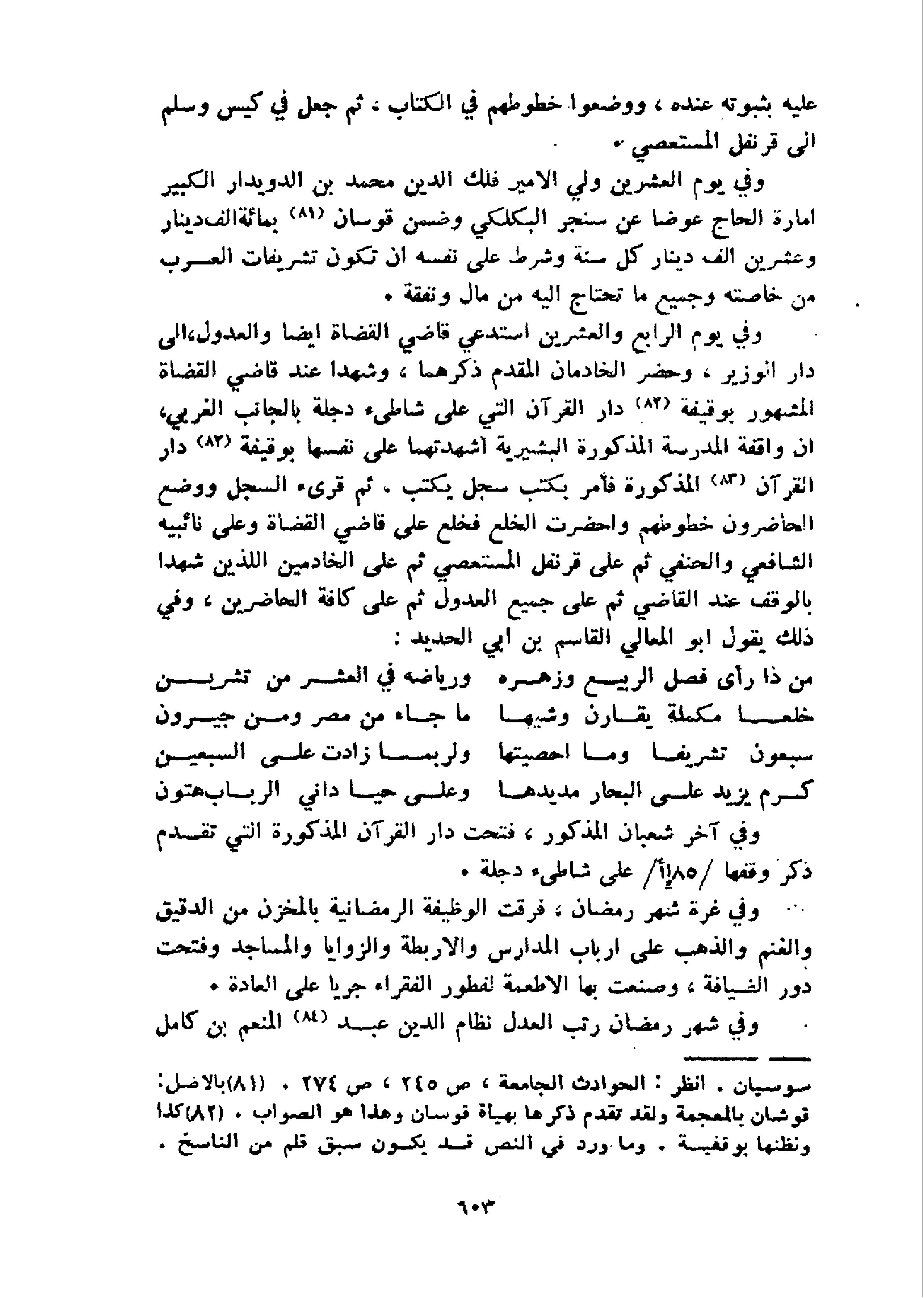 و في يوم الرابع والعشرين استدعي قاضي القضاة ايضا والعدول، الى دار الوزير، وحضر الخادمان المقدم ذكرهما، وشهدا عند قاضي القضاة المشهور بوقيفة 82 دار القرآن التي على شاطىء دجلة بالجانب الغربي، ان واقفة المدرسة المذكورة البشيرية أشهدتهما على نفسها بوقيفة 82 دار القرآن 83 المذكورة فأمر يكتب سجل يكتب، ثم قرىء السجل ووضع الحاضرون خطوطهم واحضرت الخلع فخلع على قاضي القضاة وعلى نائبيه الشافعي والحنفي ثم على قرنفل المستعصي ثم على الخادمين اللذين شهدا بالوقف عند القاضي ثم على جميع العدول ثم على كافة الحاضرين، وفي ذلك يقول ابو المعالي القاسم بن ابي الحديد: