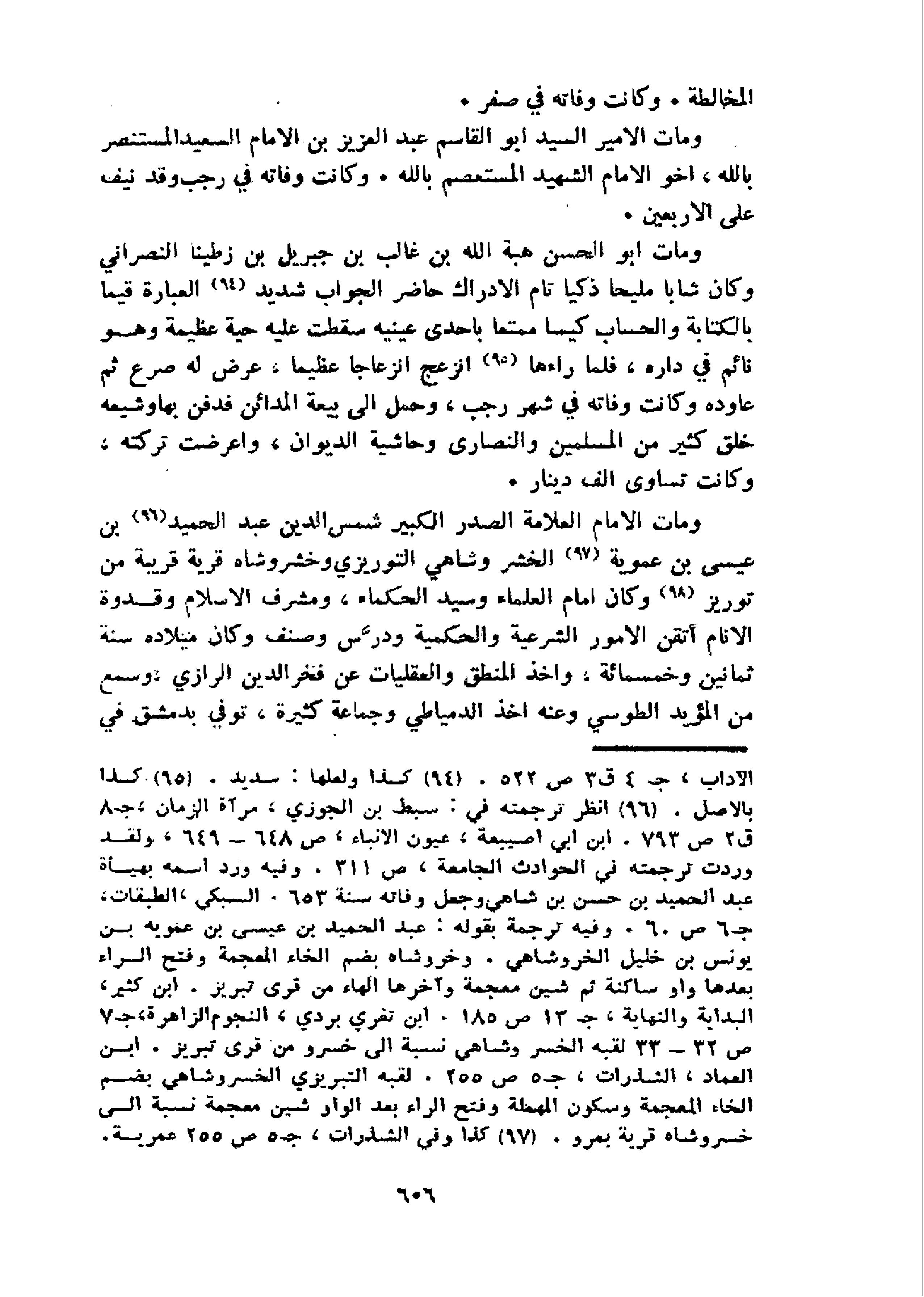 و مات الامام العلامة الصدر الكبير شمس الدين عبد الحميد 96 بن عيسى بن عموية 97 الخشر وشاهي التوريزي وخشرو شاه قرية قريبة من توريز 98 و كان امام العلماء وسيد الحكماء، ومشرف الاسلام وقدوة الانام أتقن الامور الشرعية والحكمية ودرّس وصنف وكان ميلاده سنة ثمانين وخمسمائة، واخذ المنطق والعقليات عن فخر الدين الرازي، وسمع من المؤيد الطوسي وعنه اخذ الدمياطي وجماعة كثيرة، توفي بدمشق في
