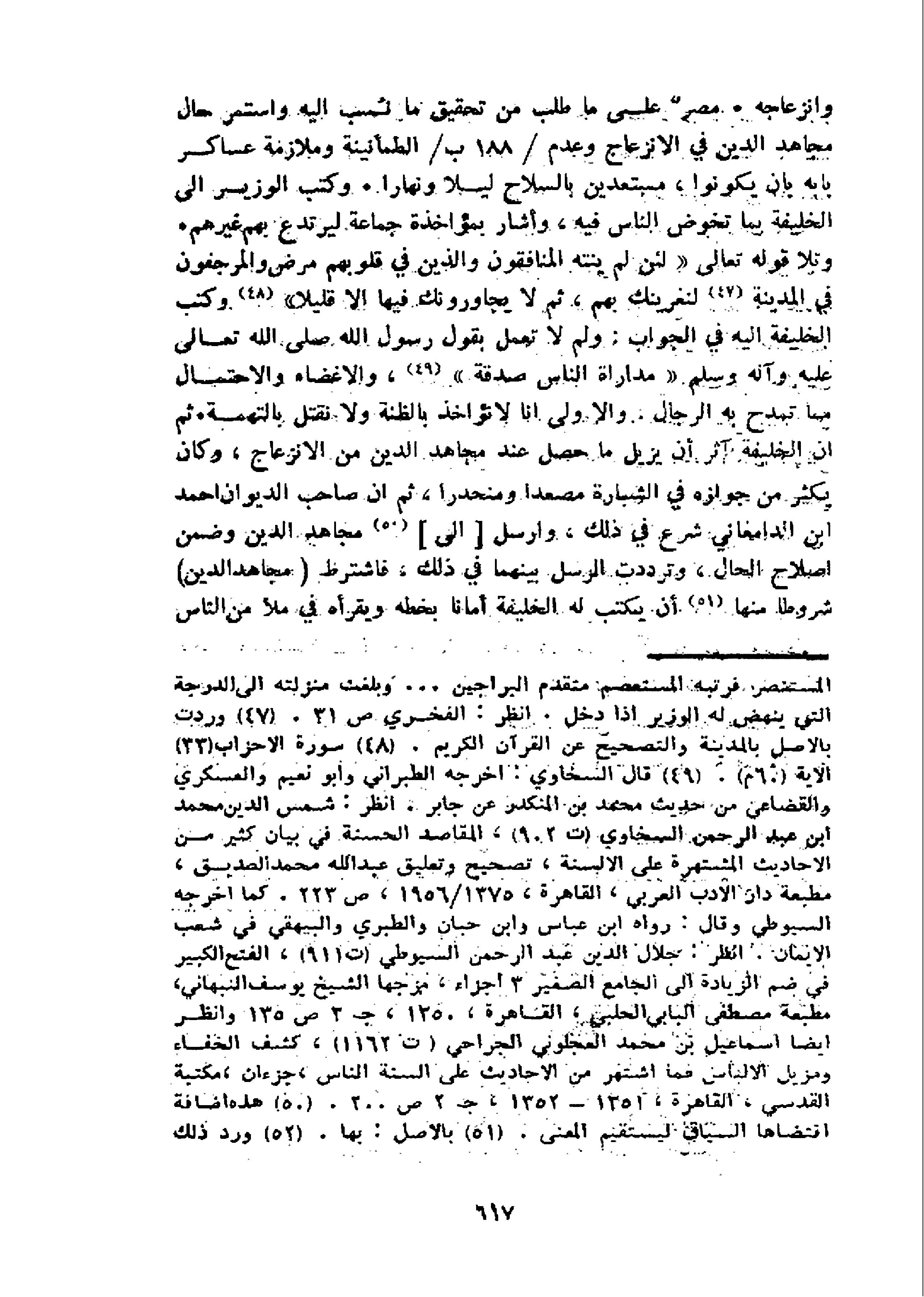 و تلا قوله تعالى «لَئِنْ لَمْ يَنْتَهِ اَلْمُنافِقُونَ وَ اَلَّذِينَ فِي قُلُوبِهِمْ مَرَضٌ وَ اَلْمُرْجِفُونَ فِي اَلْمَدِينَةِ 47 لَنُغْرِيَنَّكَ بِهِمْ، ثُمَّ لا يُجاوِرُونَكَ فِيها إِلاّ قَلِيلاً» 48 و كتب الخليفة اليه في الجواب: ولم لا تعمل بقول رسول الله صلى الله تعالى عليه وآله وسلم «مداراة الناس صدقة» 49، و الاغضاء والاحتمال مما تمدح به الرجال، والاولى انا لا نؤاخذ بالظنة ولا نقتل بالتهمة. ثم ان الخليفة آثر أن يزيل ما حصل عند مجاهد الدين من الانزعاج، وكان يكثر من جوازه في الشبارة مصعدا ومنحدرا، ثم ان صاحب الديوان احمد ابن الدامغاني شرع في ذلك، وارسل [الى] 50 مجاهد الدين وضمن اصلاح الحال، وترددت الرسل بينهما في ذلك، فاشترط (مجاهد الدين) شروطا منها 51 أن يكتب له الخليفة أمانا بخطه ويقرأه في ملأ من الناس
