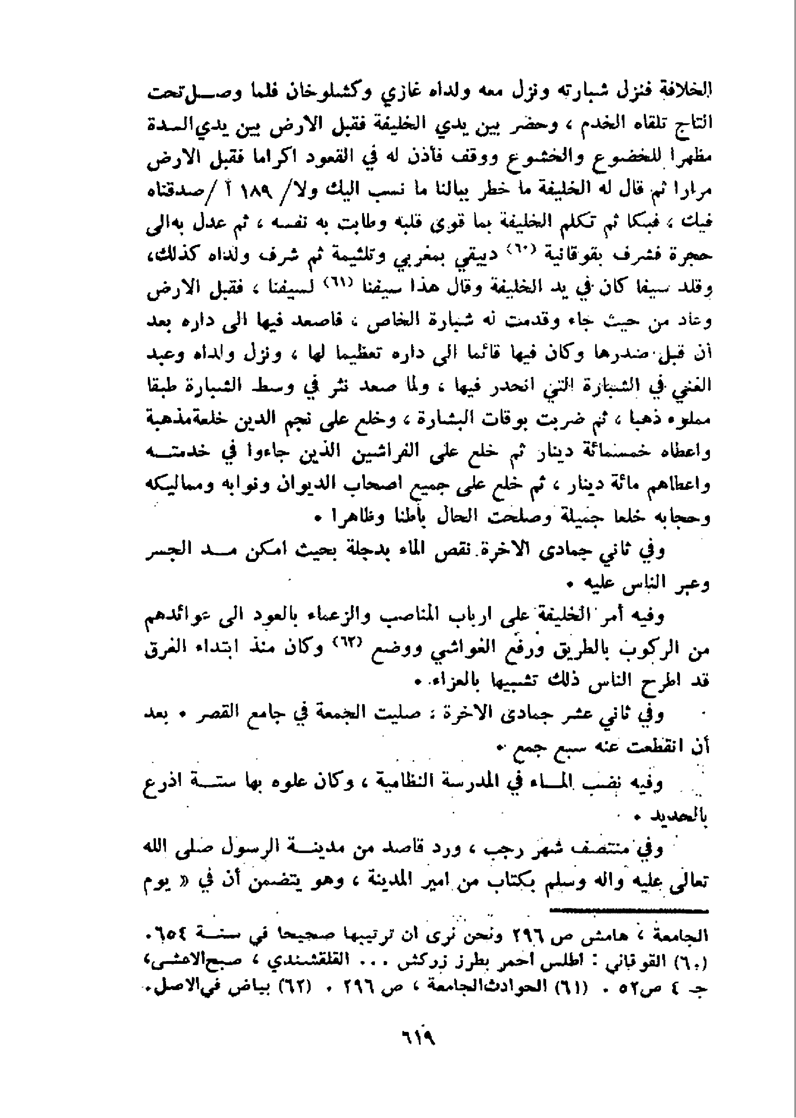 الخلافة فنزل شبارته ونزل معه ولداه غازي وكشلو خان فلما وصل تحت التاج تلقاه الخدم، وحضر بين يدي الخليفة فقبل الارض بين يدي السدة مظهرا للخضوع والخشوع ووقف فأذن له في القعود اكراما فقبل الارض مرارا ثم قال له الخليفة ما خطر ببالنا ما نسب اليك ولا 189 / أ/صدقناه فيك، فبكا ثم تكلم الخليفة بما قوى قلبه وطابت به نفسه، ثم عدل به الى حجرة فشرف بقوقانية 60 دبيقي بمغربي وتلثيمة ثم شرف ولداه كذلك، وقلد سيفا كان في يد الخليفة وقال هذا سيفنا 61 لسيفنا، فقبل الارض وعاد من حيث جاء وقدمت له شبارة الخاص، فاصعد فيها الى داره بعد أن قبل صدرها وكان فيها قائما الى داره تعظيما لها، ونزل ولداه وعبد الغني في الشبارة التي انحدر فيها، ولما صعد نثر في وسط الشبارة طبقا مملوء ذهبا، ثم ضربت بوقات البشارة، وخلع على نجم الدين خلعة مذهبة واعطاه خمسمائة دينار ثم خلع على الفراشين الذين جاءوا في خدمته واعطاهم مائة دينار، ثم خلع على جميع اصحاب الديوان ونوابه ومماليكه وحجابه خلعا جميلة وصلحت الحال باطنا وظاهرا.