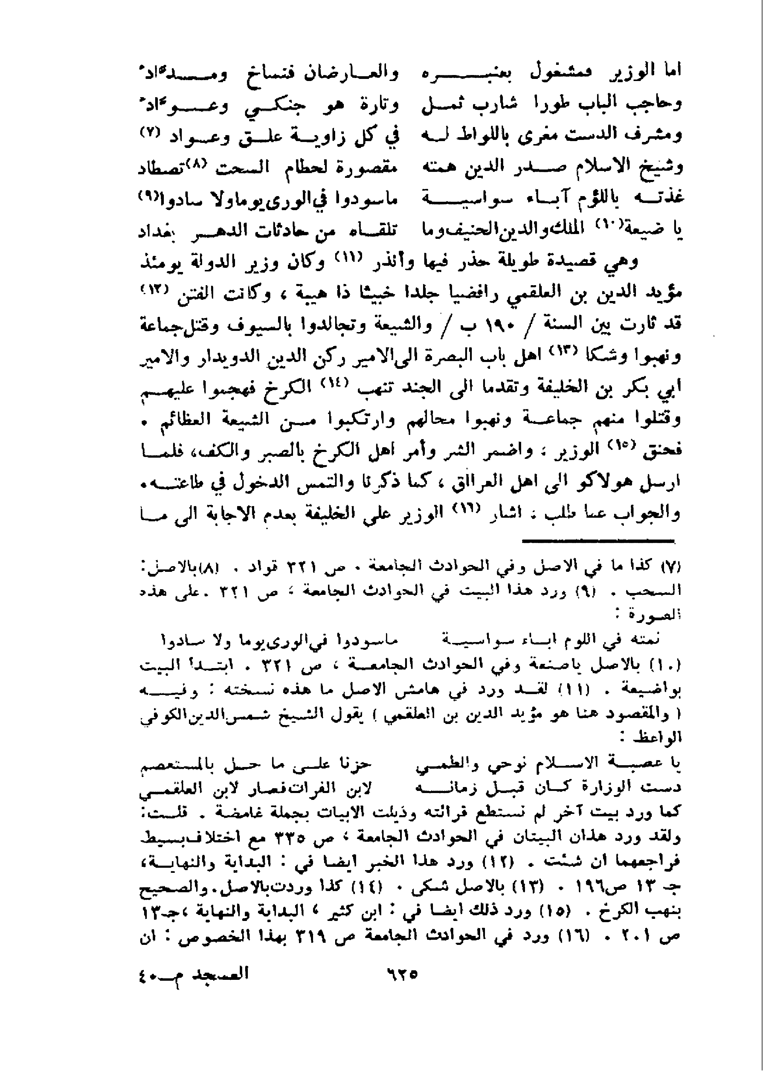 وهي قصيدة طويلة حذر فيها وأنذر 11 و كان وزير الدولة يومئذ مؤيد الدين بن العلقمي رافضيا جلدا خبيثا ذا هيبة، وكانت الفتن 12 قد ثارت بين السنة 190 / ب/و الشيعة وتجالدوا بالسيوف وقتل جماعة ونهبوا وشكا 13 اهل باب البصرة الى الامير ركن الدين الدويدار والامير ابي بكر بن الخليفة وتقدما الى الجند تنهب 14 الكرخ فهجموا عليهم وقتلوا منهم جماعة ونهبوا محالهم وارتكبوا من الشيعة العظائم.