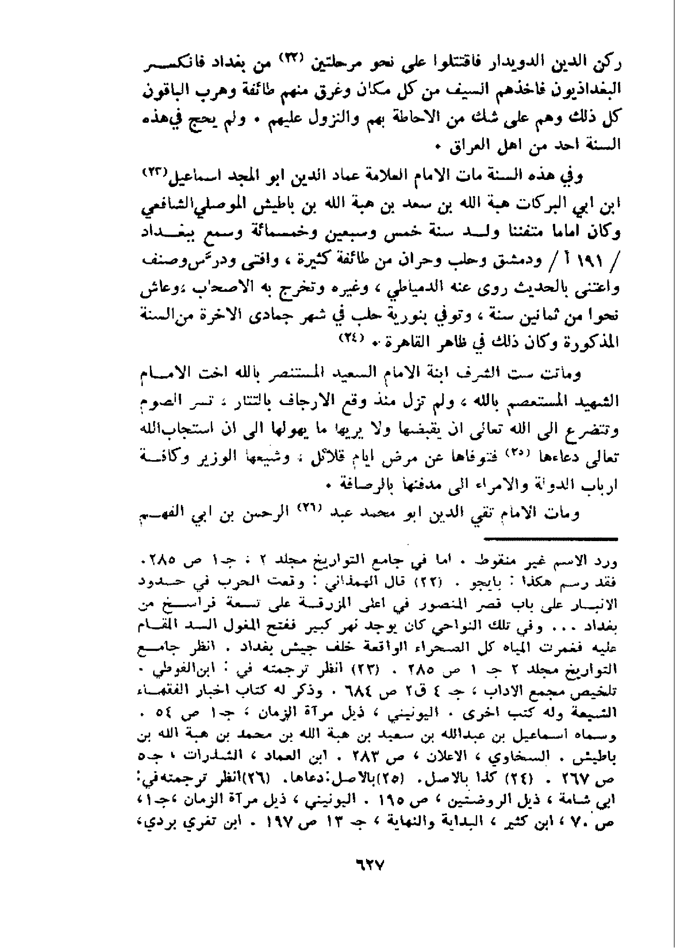 و في هذه السنة مات الامام العلامة عماد الدين ابو المجد اسماعيل 23 ابن ابي البركات هبة الله بن سعد بن هبة الله بن باطيش الموصلي الشافعي وكان اماما متفننا ولد سنة خمس وسبعين وخمسمائة وسمع ببغداد 191 / أ/و دمشق وحلب وحران من طائفة كثيرة، وافتى ودرّس وصنف واعتنى بالحديث روى عنه الدمياطي، وغيره وتخرج به الاصحاب، وعاش نحوا من ثمانين سنة، وتوفي بنورية حلب في شهر جمادى الاخرة من السنة المذكورة وكان ذلك في ظاهر القاهرة. 24