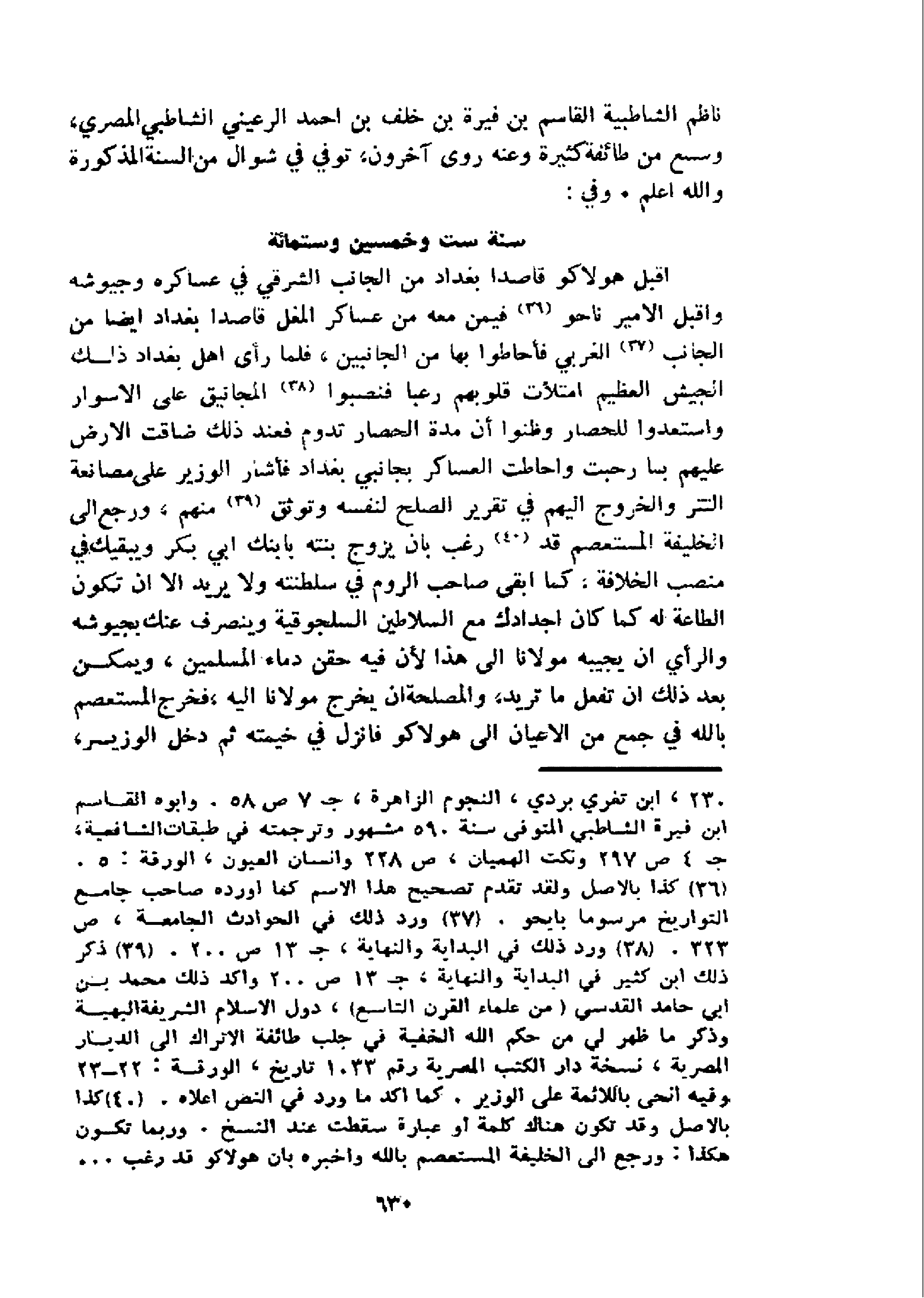 اقبل هولاكو قاصدا بغداد من الجانب الشرقي في عساكره وجيوشه واقبل الامير ناحو 36 فيمن معه من عساكر المغل قاصدا بغداد ايضا من الجانب 37 الغربي فأحاطوا بها من الجانبين، فلما رأى اهل بغداد ذلك الجيش العظيم امتلأت قلوبهم رعبا فنصبوا 38 المجانيق على الاسوار واستعدوا للحصار وظنوا أن مدة الحصار تدوم فعند ذلك ضاقت الارض عليهم بما رحبت واحاطت العساكر بجانبي بغداد فأشار الوزير على مصانعة التتر والخروج اليهم في تقرير الصلح لنفسه وتوثق 39 منهم، ورجع الى الخليفة المستعصم قد 40 رغب بان يزوج بنته بابنك ابي بكر ويبقيك في منصب الخلافة، كما ابقى صاحب الروم في سلطنته ولا يريد الا ان تكون الطاعة له كما كان اجدادك مع السلاطين السلجوقية وينصرف عنك بجيوشه والرأي ان يجيبه مولانا الى هذا لأن فيه حقن دماء المسلمين، ويمكن بعد ذلك ان تفعل ما تريد، والمصلحة ان يخرج مولانا اليه، فخرج المستعصم بالله في جمع من الاعيان الى هولاكو فانزل في خيمته ثم دخل الوزير،
