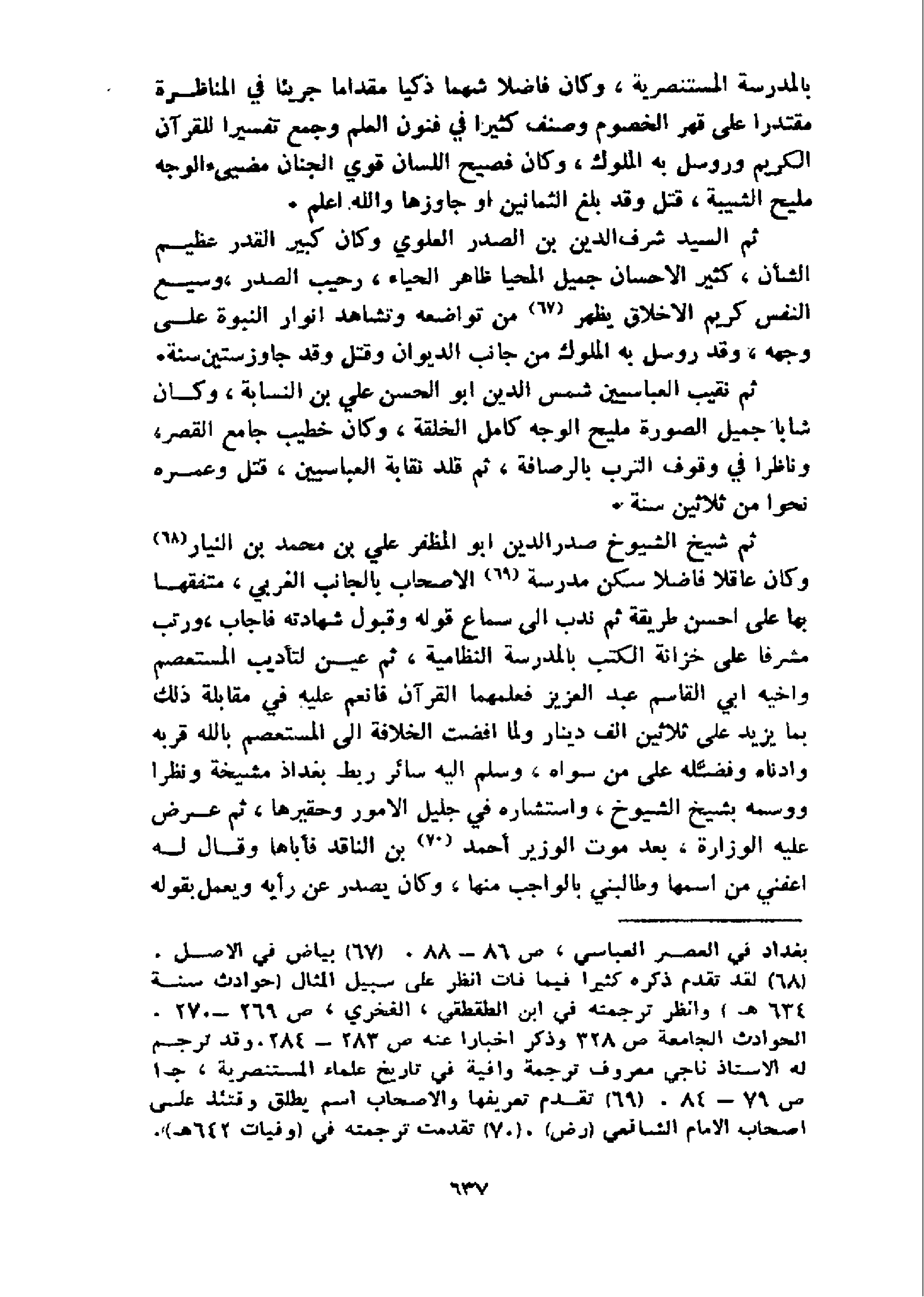 بالمدرسة المستنصرية، وكان فاضلا شهما ذكيا مقداما جريئا في المناظرة مقتدرا على قهر الخصوم وصنف كثيرا في فنون العلم وجمع تفسيرا للقرآن الكريم وروسل به الملوك، وكان فصيح اللسان قوي الجنان مضيىء الوجه مليح الشيبة، قتل وقد بلغ الثمانين او جاوزها والله اعلم.