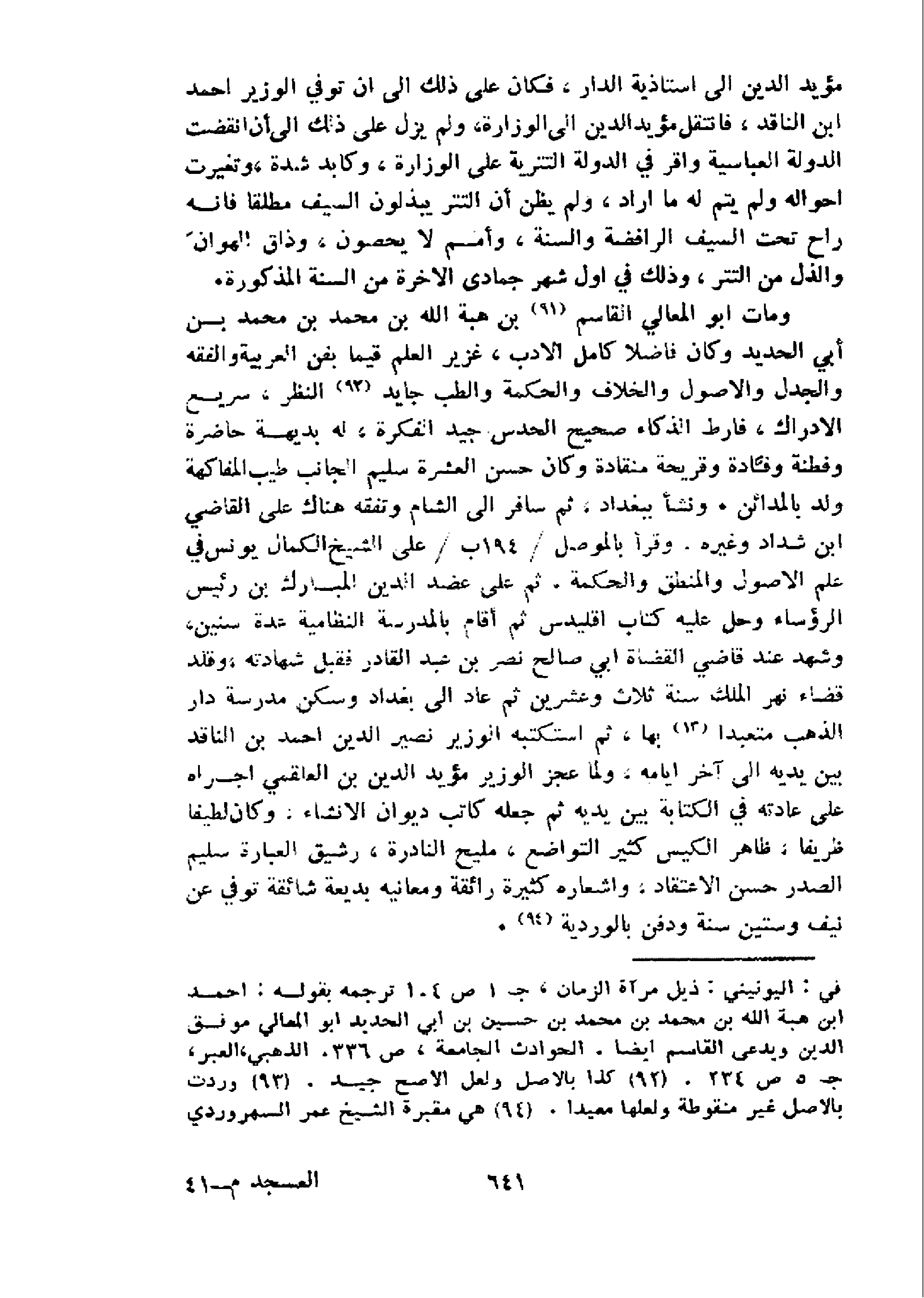 و مات ابو المعالي القاسم 91 بن هبة الله بن محمد بن محمد بن أبي الحديد وكان فاضلا كامل الادب، غزير العلم قيما بفن العربية والفقه والجدل والاصول والخلاف والحكمة والطب جايد 92 النظر، سريع الادراك، فارط الذكاء صحيح الحدس جيد الفكرة، له بديهة حاضرة وفطنة وقّادة وقريحة منقادة وكان حسن العشرة سليم الجانب طيب المفاكهة ولد بالمدائن. ونشأ ببغداد، ثم سافر الى الشام وتفقه هناك على القاضي ابن شداد وغيره. وقرأ بالموصل 94 / ب/على الشيخ الكمال يونس في علم الاصول والمنطق والحكمة، ثم على عضد الدين المبارك بن رئيس الرؤساء وحل عليه كتاب اقليدس ثم أقام بالمدرسة النظامية عدة سنين، وشهد عند قاضي القضاة ابي صالح نصر بن عبد القادر فقبل شهادته، وقلد قضاء نهر الملك سنة ثلاث وعشرين ثم عاد الى بغداد وسكن مدرسة دار الذهب متعبدا 93 بها، ثم استكتبه الوزير نصير الدين احمد بن الناقد بين يديه الى آخر ايامه، ولما عجز الوزير مؤيد الدين بن العلقمي اجراه على عادته في الكتابة بين يديه ثم جعله كاتب ديوان الانشاء، وكان لطيفا ظريفا، ظاهر الكيس كثير التواضع، مليح النادرة، رشيق العبارة سليم الصدر حسن الاعتقاد، واشعاره كثيرة رائقة ومعانيه بديعة شائقة توفي عن نيف وستين سنة ودفن بالوردية 94.