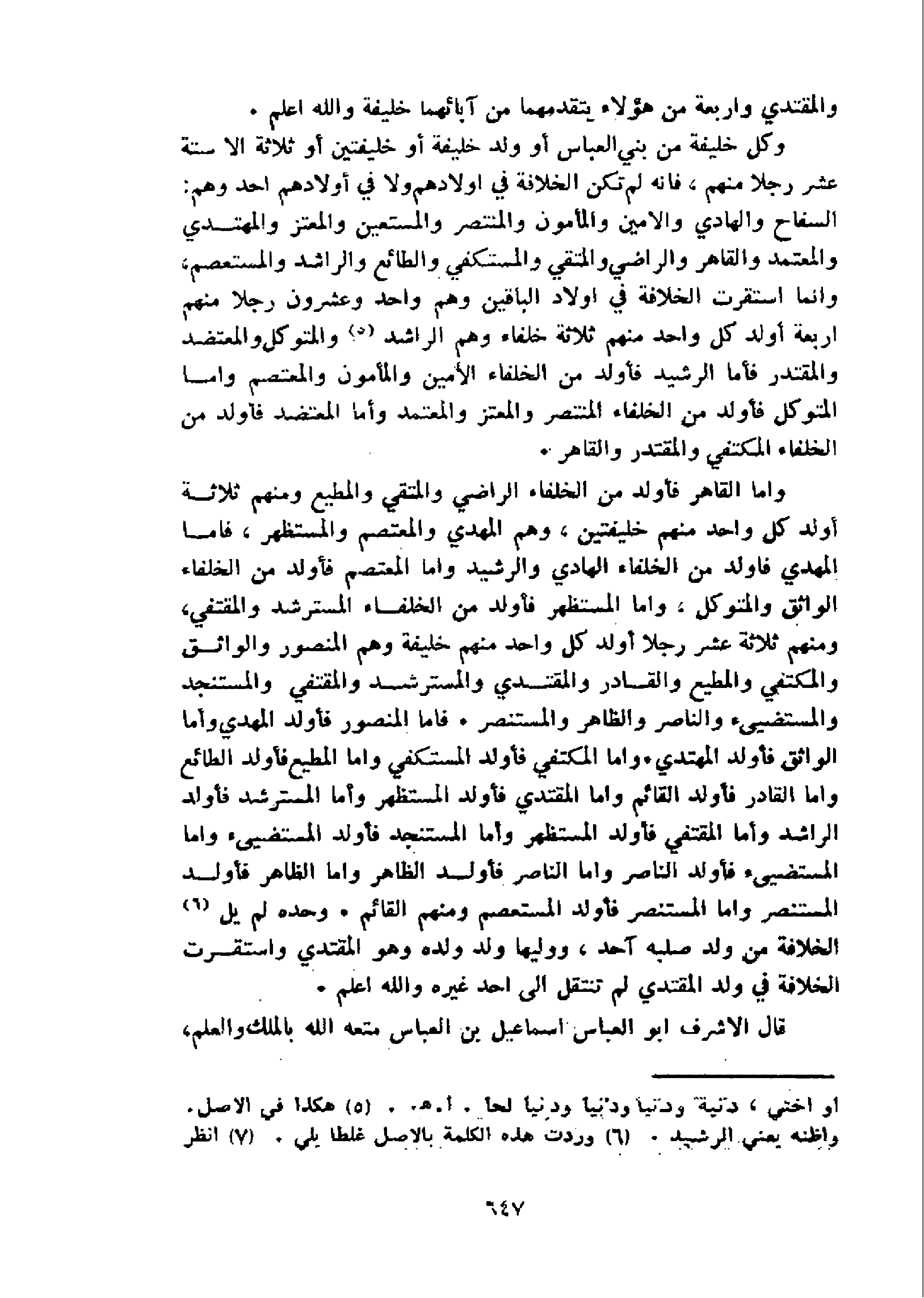 السفاح والهادي والامين والمأمون والمنتصر والمستعين والمعتز والمهتدي والمعتمد والقاهر والراضي والمتقي والمستكفي والطائع والراشد والمستعصم، وانما استقرت الخلافة في اولاد الباقين وهم واحد وعشرون رجلا منهم اربعة أولد كل واحد منهم ثلاثة خلفاء وهم الراشد 5 والمتوكل والمعتضد والمقتدر فأما الرشيد فأولد من الخلفاء الأمين والمأمون والمعتصم واما المتوكل فأولد من الخلفاء المنتصر والمعتز والمعتمد وأما المعتضد فأولد من الخلفاء المكتفي والمقتدر والقاهر.
