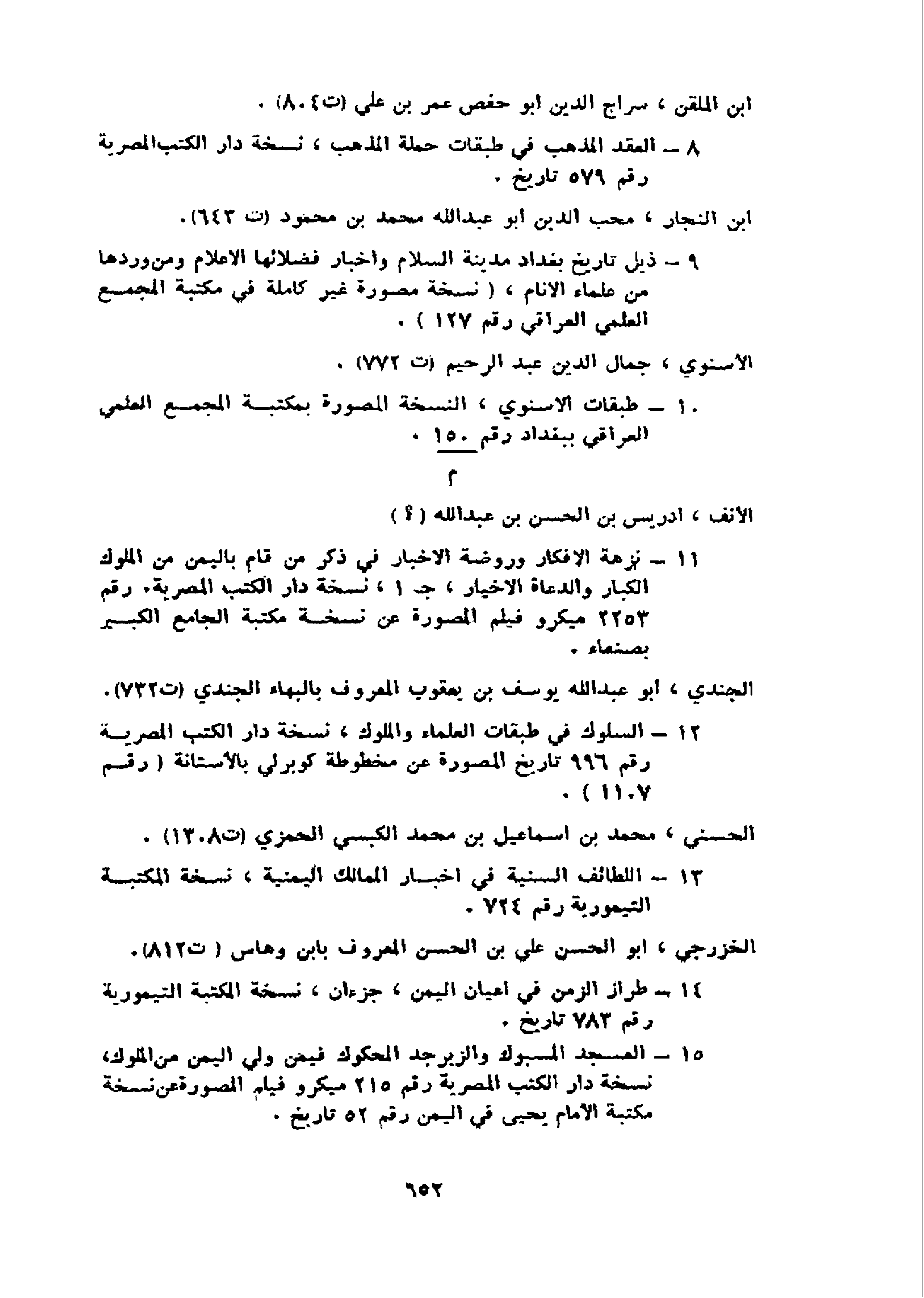 15 - العسجد المسبوك والزبرجد المحكوك فيمن ولي اليمن من الملوك، نسخة دار الكتب المصرية رقم 215 ميكروفيلم المصورة عن نسخة مكتبة الامام يحيى في اليمن رقم 52 تاريخ.