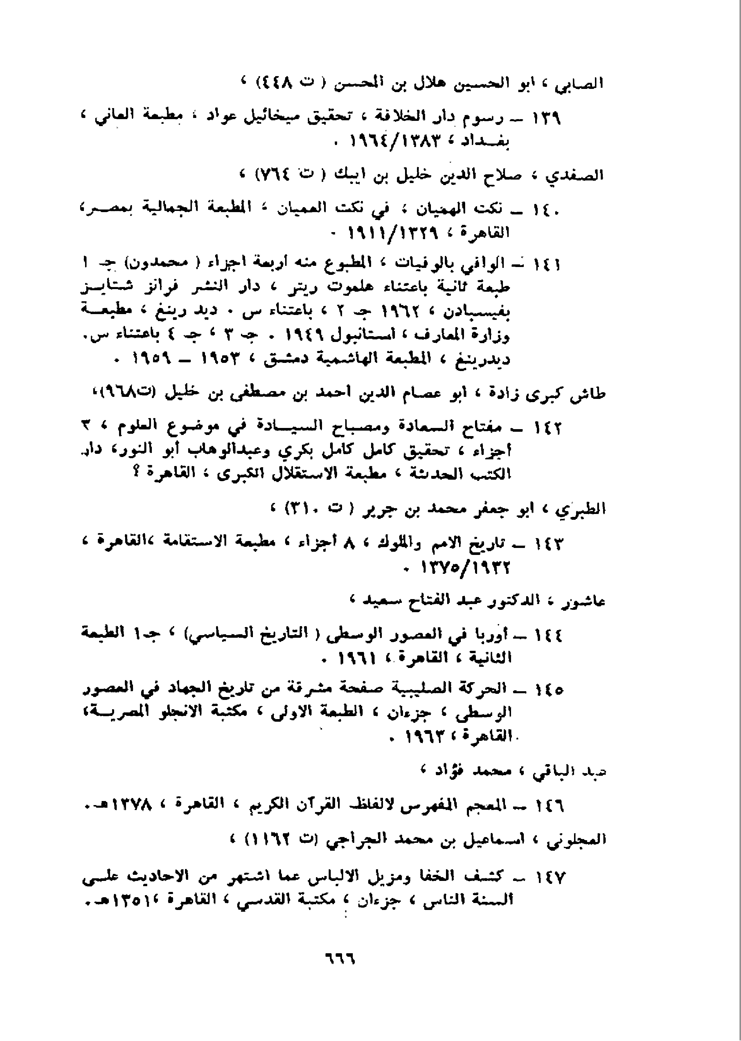 141 - الوافي بالوفيات، المطبوع منه أربعة اجزاء (محمدون) جـ 1 طبعة ثانية باعتناء هلموت ريتر، دار النشر فرانز شتايز بفيسبادن، 1962 جـ 2، باعتناء س. ديدرينغ، مطبعة وزارة المعارف، استانبول 1949.جـ 3، جـ 4 باعتناء س. ديدرينغ، المطبعة الهاشمية دمشق، 1953 - 1959.