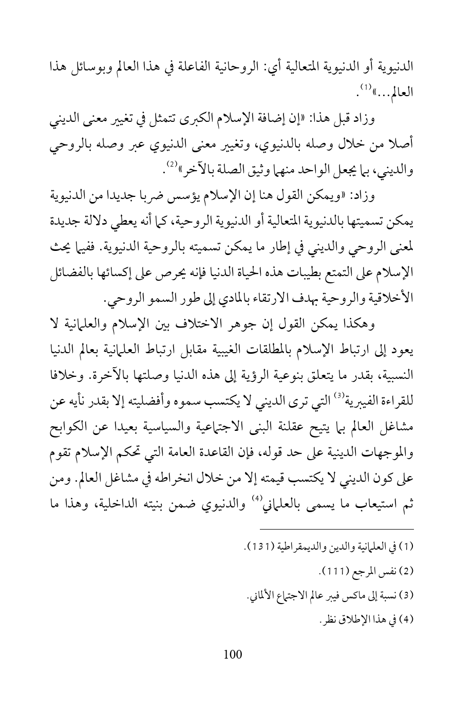 وزاد قبل هذا: «إن إضافة الإسلام الكبرى تتمثل في تغيير معنى الديني أصلا من خلال وصله بالدنيوي، وتغيير معنى الدنيوي عبر وصله بالروحي والديني، بما يجعل الواحد منهما وثيق الصلة بالآخر» (¬2).