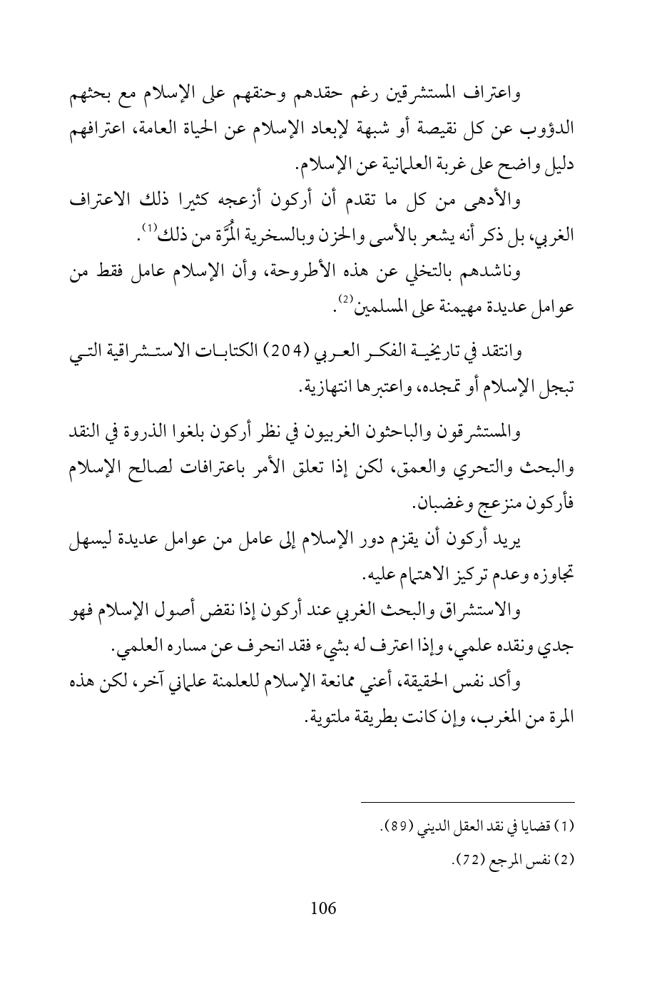 والاستشراق والبحث الغربي عند أركون إذا نقض أصول الإسلام فهو جدي ونقده علمي، وإذا اعترف له بشيء فقد انحرف عن مساره العلمي.