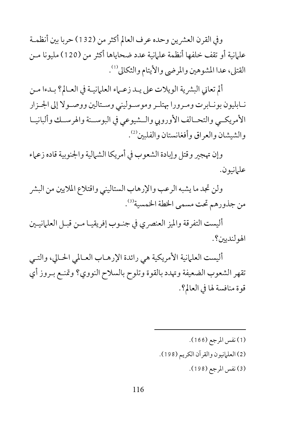 وفي القرن العشرين وحده عرف العالم أكثر من (132) حربا بين أنظمة علمانية أو تقف خلفها أنظمة علمانية عدد ضحاياها أكثر من (120) مليونا من القتلى، عدا المشوهين والمرضى والأيتام والثكالى (¬1).