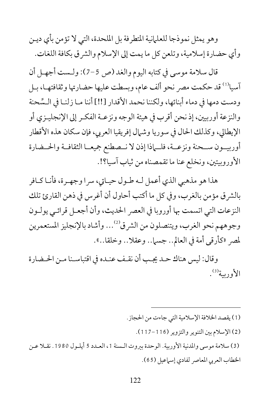 (¬3) سلامة موسى والمدنية الأوربية. الوحدة بيروت السنة 1، العدد 5 أيلول 1980. نقلا عن الخطاب العربي المعاصر لفادي إسماعيل (65).