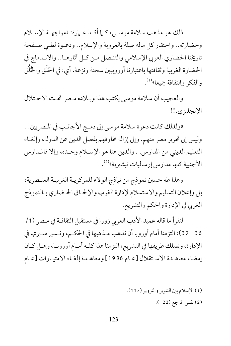 ذلك هو مذهب سلامة موسى، كما أكد عمارة: «مواجهة الإسلام وحضارته .. واحتقار كل ماله صلة بالعروبة والإسلام .. ودعوة لطي صفحة تاريخنا الحضاري العربي الإسلامي والتنصل من كل آثارها .. والاندماج في الحضارة الغربية وثقافتها باعتبارنا أوروبيين سحنة ونزعة، أي: في الخَلْق والخُلُق والفكر والثقافة جميعا» (¬1).