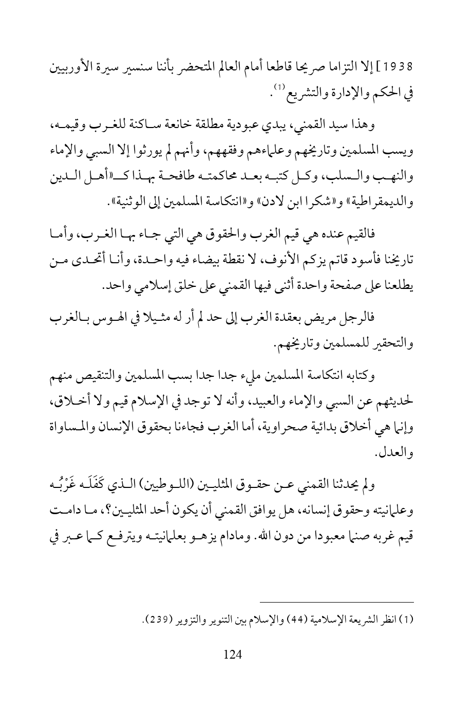 1938] إلا التزاما صريحا قاطعا أمام العالم المتحضر بأننا سنسير سيرة الأوربيين في الحكم والإدارة والتشريع (¬1).