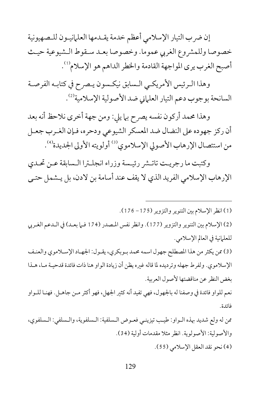 (¬2) الإسلام بين التنوير والتزوير (177). وانظر نفس المصدر (174 فما بعد) في الدعم الغربي للعلمانية في العالم الإسلامي.