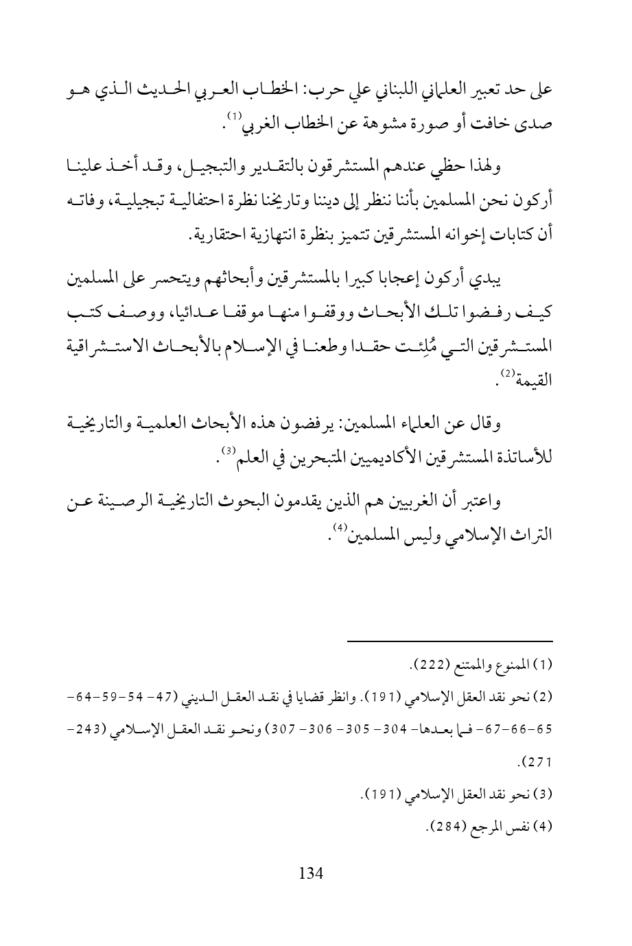 (¬2) نحو نقد العقل الإسلامي (191). وانظر قضايا في نقد العقل الديني (47 - 54 - 59 - 64 - 65 - 66 - 67 - فما بعدها- 304 - 305 - 306 - 307) ونحو نقد العقل الإسلامي (243 - 271).