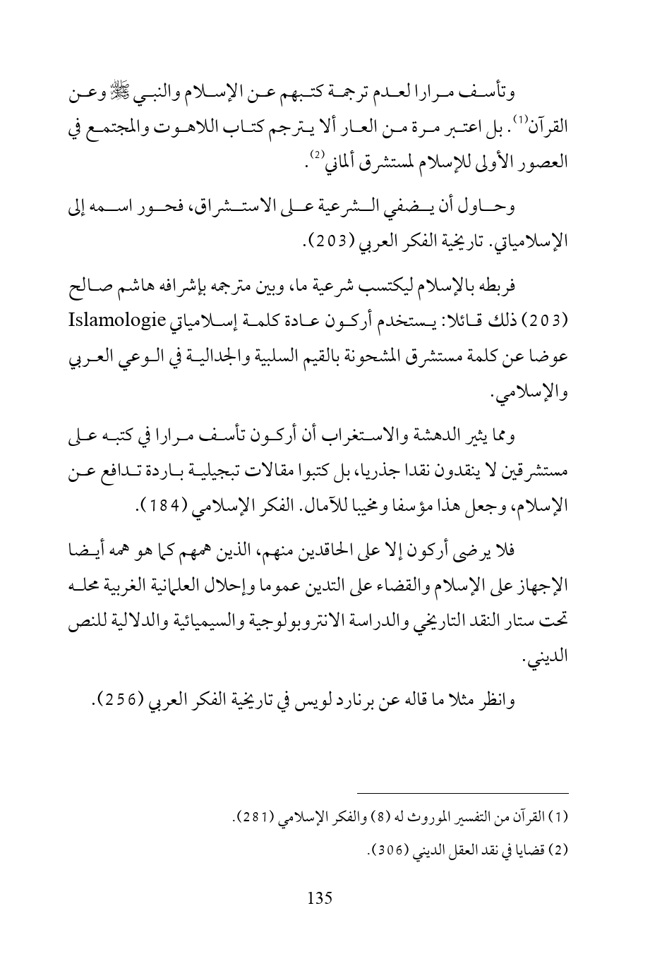 وحاول أن يضفي الشرعية على الاستشراق، فحور اسمه إلى الإسلامياتي. تاريخية الفكر العربي (203).