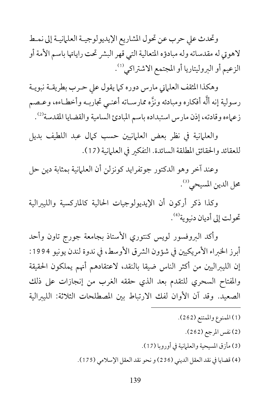 وكذا ذكر أركون أن الإيديولوجيات الحالية كالماركسية والليبرالية تحولت إلى أديان دنيوية (¬4).