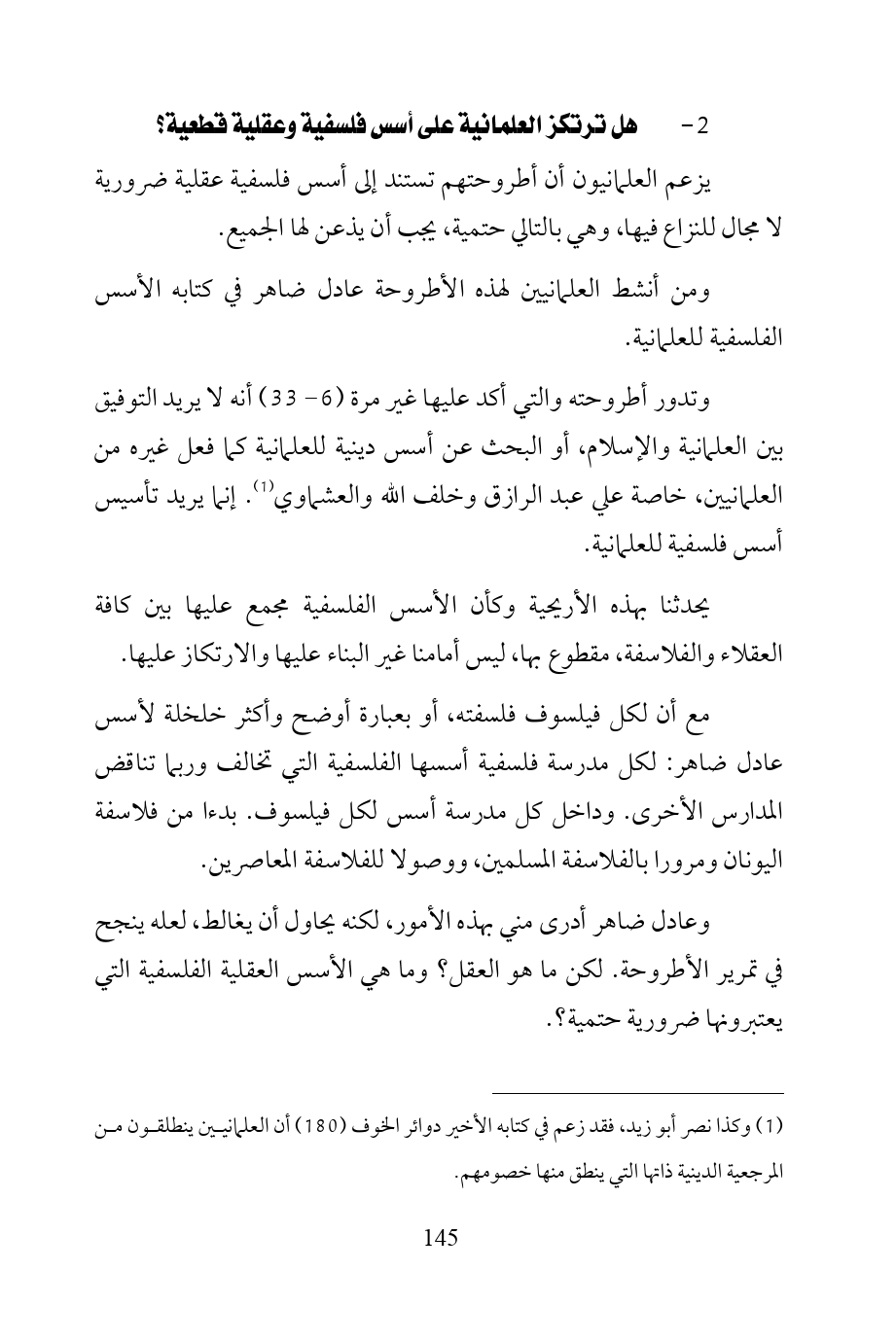 (¬1) وكذا نصر أبو زيد، فقد زعم في كتابه الأخير دوائر الخوف (180) أن العلمانيين ينطلقون من المرجعية الدينية ذاتها التي ينطق منها خصومهم.