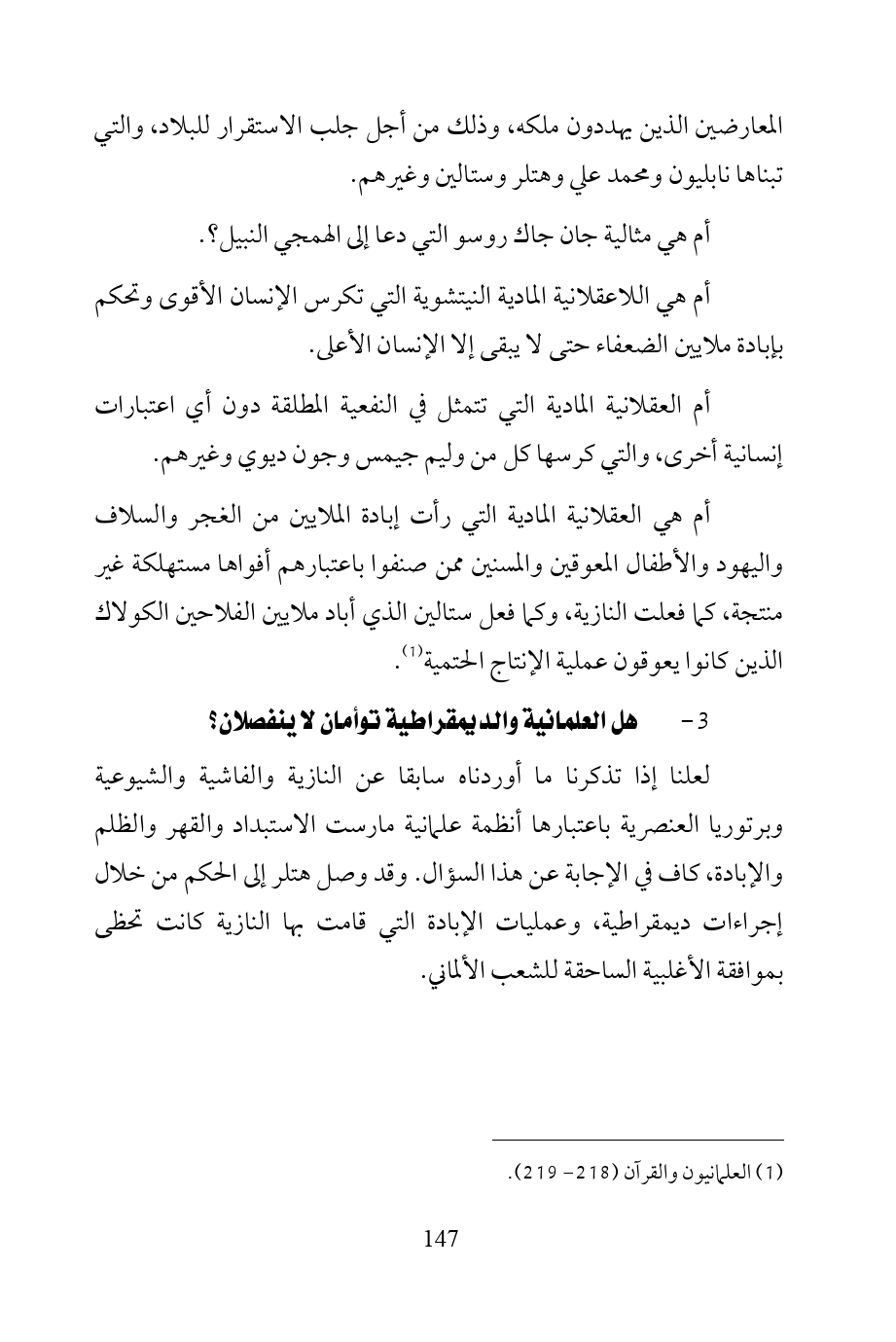 أم هي العقلانية المادية التي رأت إبادة الملايين من الغجر والسلاف واليهود والأطفال المعوقين والمسنين ممن صنفوا باعتبارهم أفواها مستهلكة غير منتجة، كما فعلت النازية، وكما فعل ستالين الذي أباد ملايين الفلاحين الكولاك الذين كانوا يعوقون عملية الإنتاج الحتمية (¬1).