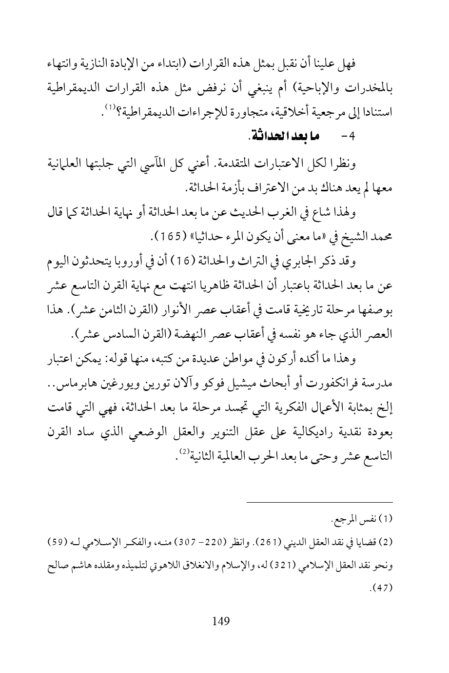 ونظرا لكل الاعتبارات المتقدمة. أعني كل المآسي التي جلبتها العلمانية معها لم يعد هناك بد من الاعتراف بأزمة الحداثة.