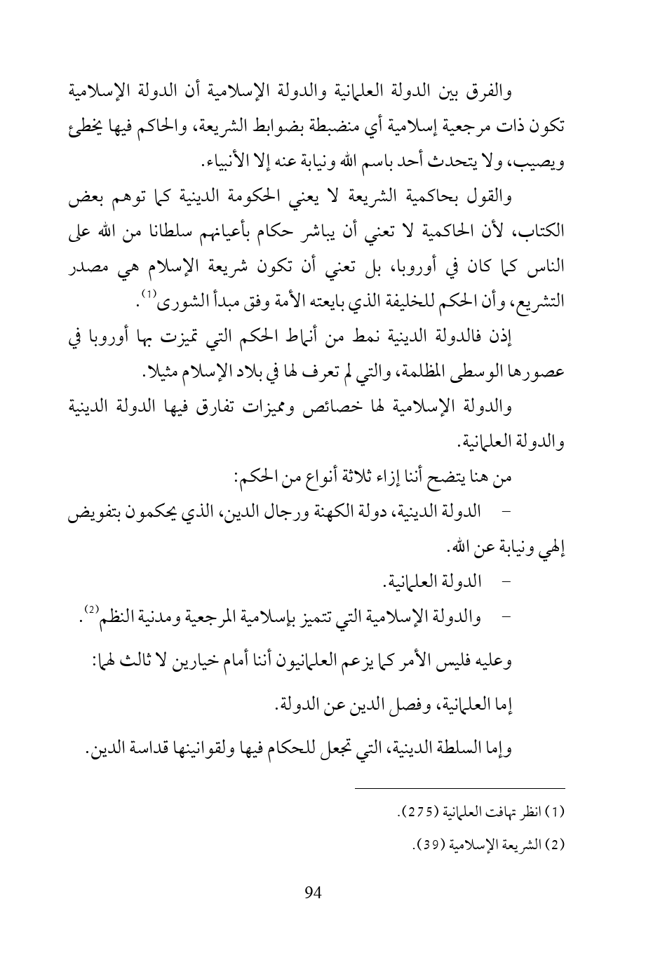 والقول بحاكمية الشريعة لا يعني الحكومة الدينية كما توهم بعض الكتاب، لأن الحاكمية لا تعني أن يباشر حكام بأعيانهم سلطانا من الله على الناس كما كان في أوروبا، بل تعني أن تكون شريعة الإسلام هي مصدر التشريع، وأن الحكم للخليفة الذي بايعته الأمة وفق مبدأ الشورى (¬1).