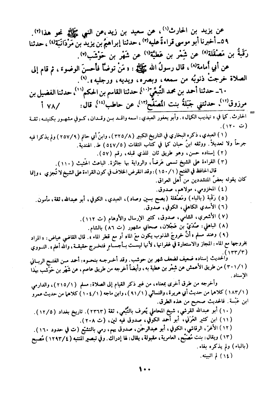 59 - أَخْبَرَنَا أَبُو مُوسَى قِرَاءَةً عَلَيْهِ , حَدَّثَنَا إِبْرَاهِيمُ بْنُ يَزِيدَ بْنِ مَرْدَانِبَةَ، حَدَّثَنَا رَقَبَةُ بْنُ مَصْقَلَةَ، عَنْ شِمْرِ بْنِ عَطِيَّةَ، عَنْ شَهْرِ بْنِ حَوْشَبٍ، عَنْ أَبِي أُمَامَةَ: قَالَ رَسُولُ اللَّهِ صَلَّى اللهُ عَلَيْهِ وَسَلَّمَ: «§مَنْ تَوَضَّأَ فَأَحْسَنَ الْوُضُوءَ , ثُمَّ قَامَ إِلَى الصَّلَاةِ خَرَجَتْ ذُنُوبُهُ مِنْ سَمْعِهِ وَبَصَرِهِ وَيَدَيْهِ وَرِجْلَيْهِ»