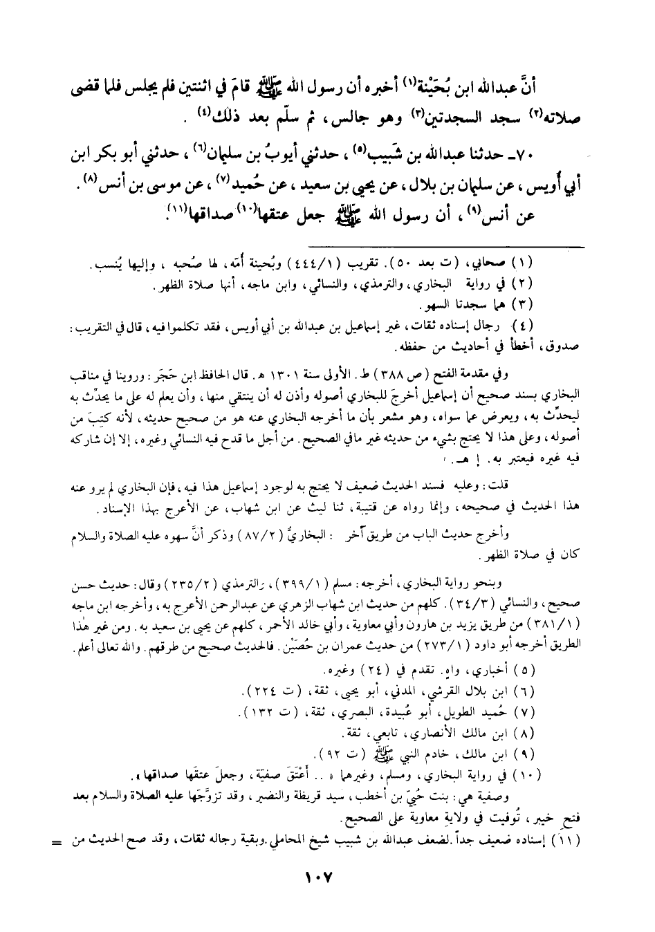 70 - حَدَّثَنَا عَبْدُ اللَّهِ بْنُ شَبِيبٍ، حَدَّثَنِي أَيُّوبُ بْنُ سُلَيْمَانَ، حَدَّثَنِي أَبُو بَكْرِ بْنُ أَبِي أُوَيْسٍ، عَنْ سُلَيْمَانَ بْنِ بِلَالٍ، عَنْ يَحْيَى بْنِ سَعِيدٍ، عَنْ حُمَيْدٍ، عَنْ مُوسَى بْنِ أَنَسٍ، عَنْ أَنَسٍ: " أَنَّ رَسُولَ اللَّهِ صَلَّى اللهُ عَلَيْهِ وَسَلَّمَ §جَعَلَ عِتْقَهَا صَدَاقَهَا