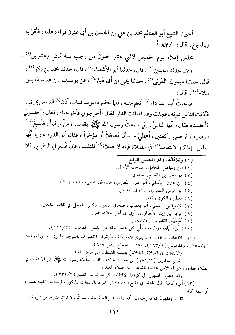 71 - حَدَّثَنَا الْحُسَيْنُ قَالَ: حَدَّثَنَا أَبُو الْأَشْعَثِ قَالَ: حَدَّثَنَا مُحَمَّدُ بْنُ بَكْرٍ قَالَ: حَدَّثَنَا مَيْمُونُ الْمَرَئِيُّ، حَدَّثَنَا يَحْيَى بْنُ أَبِي هَيْثَمٍ، عَنْ يُوسُفَ بْنِ عَبْدِ اللَّهِ بْنِ سَلَّامٍ قَالَ: صَحِبْتُ أَبَا الدَّرْدَاءِ أَتَعَلَّمُ مِنْهُ , فَلَمَّا حَضَرَهُ الْمَوْتُ قَالَ: آذِنِ النَّاسَ بِمَوْتِي , فَآذَنْتُ النَّاسَ بِمَوْتِهِ , فَجِئْتُ وَقَدِ امْتَلَئَتِ الدَّارُ , فَقَالَ: أَخْرِجُونِي , فَأَخْرَجْنَاهُ , فَقَالَ: أَجْلِسُونِي , فَأَجْلَسْنَاهُ , فَقَالَ: أَيُّهَا النَّاسُ , إِنِّي سَمِعْتُ رَسُولَ اللَّهِ صَلَّى اللهُ عَلَيْهِ وَسَلَّمَ يَقُولُ: «§مَنْ تَوَضَّأَ فَأَسْبَغَ الْوُضُوءَ , ثُمَّ صَلَّى رَكْعَتَيْنِ , أُعْطِيَ مَا سَأَلَ مُعَجَّلًا أَوْ مُؤَخَّرًا» , فَقَالَ أَبُو الدَّرْدَاءِ: يَا أَيُّهَا النَّاسُ , إِيَّاكُمْ وَالِالْتِفَاتَ فِي الصَّلَاةِ؛ فَإِنَّهُ لَا صَلَاةَ لِمُلْتَفِتٍ , فَإِنْ غُلِبْتُمْ فِي التَّطَوُّعِ فَلَا -[112]- تُغْلَبُوا فِي الْفَرِيضَةِ