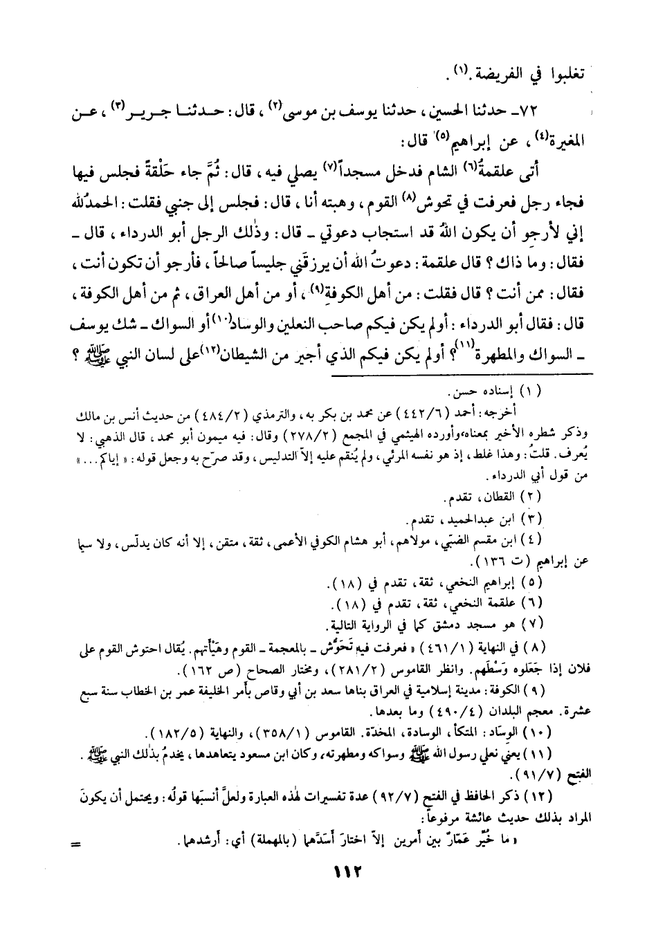 72 - حَدَّثَنَا الْحُسَيْنُ حَدَّثَنَا يُوسُفُ بْنُ مُوسَى قَالَ: حَدَّثَنَا جَرِيرٌ، عَنِ الْمُغِيرَةِ، عَنْ إِبْرَاهِيمَ قَالَ: أَتَى عَلْقَمَةَ الشَّامَ , فَدَخَلَ مَسْجِدًا يُصَلِّي فِيهِ قَالَ: ثُمَّ جَاءَ حَلْقَةً , فَجَلَسَ فِيهَا , فَجَاءَ رَجُلٌ , فَعَرَفْتُ فِيهِ تَحَوُّشَ الْقَوْمِ وَهِبْتُهُ أَنَا، قَالَ: فَجَلَسَ إِلَى جَنْبِي فَقُلْتُ: الْحَمْدُ لِلَّهِ، إِنِّي لَأَرْجُو أَنْ يَكُونَ اللَّهُ قَدِ اسْتَجَابَ دَعْوَتِي، قَالَ: وَذَلِكَ الرَّجُلُ أَبُو الدَّرْدَاءِ قَالَ: فَقَالَ: وَمَا ذَاكَ؟ قَالَ عَلْقَمَةُ: دَعَوْتُ اللَّهَ أَنْ يَرْزُقَنِي جَلِيسًا صَالِحًا , فَأَرْجُو أَنْ تَكُونَ أَنْتَ , فَقَالَ: مِمَّنْ أَنْتَ؟ قَالَ: فَقُلْتُ: مِنْ أَهْلِ الْكُوفَةِ , أَوْ مِنْ أَهْلِ الْعِرَاقِ , ثُمَّ مِنْ أَهْلِ الْكُوفَةِ قَالَ: فَقَالَ أَبُو الدَّرْدَاءِ: " §أَوَلَمْ يَكُنْ فِيكُمْ صَاحِبُ النَّعْلَيْنِ وَالْوِسَادِ أَوِ السِّوَاكِ شَكَّ يُوسُفُ السِّوَاكِ وَالْمِطْهَرَةِ؟ أَوَلَمْ يَكُنْ فِيكُمُ الَّذِي أُجِيرَ مِنَ الشَّيْطَانِ عَلَى لِسَانِ النَّبِيِّ صَلَّى اللهُ عَلَيْهِ وَسَلَّمَ؟ -[113]- قَالَ: يَعْنِي عَمَّارَ بْنَ يَاسِرٍ وَصَاحِبُ النَّعْلَيْنِ وَالْوِسَادِ أَوِ السِّوَاكِ وَالْمِطْهَرَةِ عَبْدُ اللَّهِ بْنُ مَسْعُودٍ قَالَ: أَوَلَمْ يَكُنْ فِيكُمْ صَاحِبُ السِّرِّ الَّذِي لَا يَعْلَمُهُ غَيْرُهُ أَوْ أَحَدٌ غَيْرُهُ؟ قَالَ: يَعْنِي حُذَيْفَةَ , ثُمَّ قَالَ: تَحْفَظُ كَيْفَ كَانَ عَبْدُ اللَّهِ يَقْرَأُ؟ قَالَ: قُلْتُ: نَعَمْ قَالَ: {وَاللَّيْلِ إِذَا يَغْشَى وَالنَّهَارِ إِذَا تَجَلَّى} [الليل: 2] , قَالَ عَلْقَمَةُ: فَقُلْتُ: (وَالذَّكَرِ وَالْأُنْثَى) قَالَ أَبُو الدَّرْدَاءِ: وَاللَّهِ , الَّذِي لَا إِلَهَ إِلَّا هُوَ «لَهَكَذَا أَقْرَأَنِي رَسُولُ اللَّهِ صَلَّى اللهُ عَلَيْهِ وَسَلَّمَ مِنْ فِيهِ إِلَى فِي» , فَمَا زَالَ هَؤُلَاءِ حَتَّى كَادُوا أَنْ يَرُدُّونِي عَنْهَا "