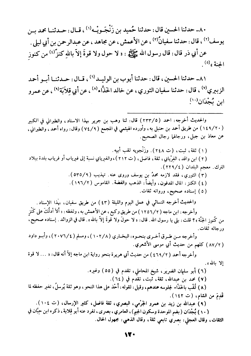 80 - حَدَّثَنَا الْحُسَيْنُ قَالَ حَدَّثَنَا حُمَيْدُ بْنُ زَنْجُوَيْهِ قَالَ: حَدَّثَنَا مُحَمَّدُ بْنُ يُوسُفَ قَالَ: حَدَّثَنَا سُفْيَانُ، عَنِ الْأَعْمَشِ، عَنْ مُجَاهِدٍ، عَنْ عَبْدِ الرَّحْمَنِ بْنِ أَبِي لَيْلَى، عَنْ أَبِي ذَرٍّ قَالَ: قَالَ رَسُولُ اللَّهِ صَلَّى اللهُ عَلَيْهِ وَسَلَّمَ: «§لَا حَوْلَ وَلَا قُوَّةَ إِلَّا بِاللَّهِ كَنْزٌ مِنْ كُنُوزِ الْجَنَّةِ»
