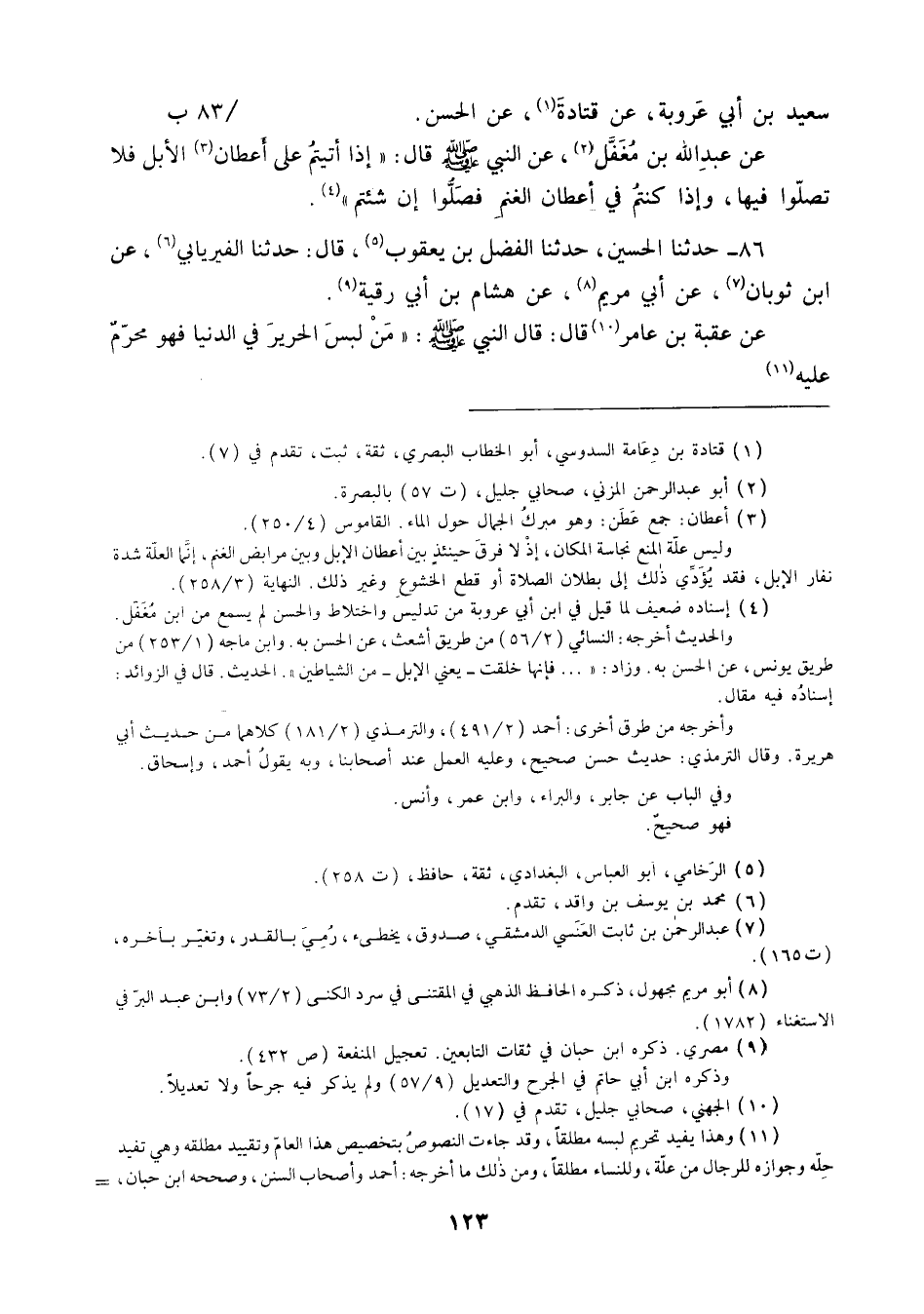 86 - حَدَّثَنَا الْحُسَيْنُ قَالَ حَدَّثَنَا الْفَضْلُ بْنُ يَعْقُوبَ قَالَ: حَدَّثَنَا الْفِرْيَابِيُّ، عَنِ ابْنِ ثَوْبَانَ، عَنْ أَبِي مَرْيَمَ، عَنْ هِشَامِ بْنِ أَبِي رُقَيَّةَ، عَنْ عُقْبَةَ بْنِ عَامِرٍ قَالَ: قَالَ النَّبِيُّ صَلَّى اللهُ عَلَيْهِ وَسَلَّمَ: «§مَنْ لَبِسَ الْحَرِيرَ فِي الدُّنْيَا فَهُوَ مُحَرَّمٌ عَلَيْهِ فِي الْآخِرَةِ»