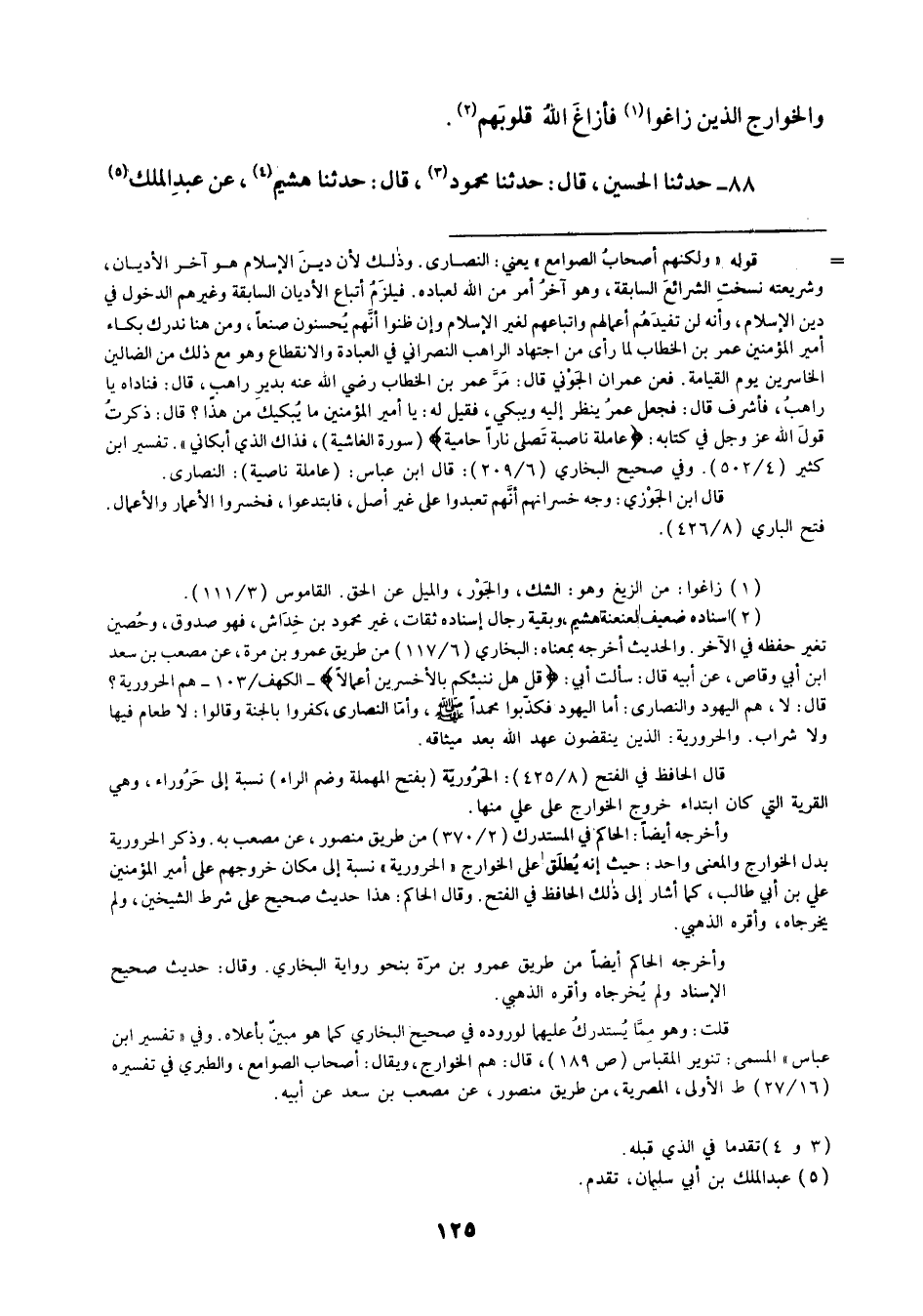 88 - حَدَّثَنَا الْحُسَيْنُ قَالَ حَدَّثَنَا مَحْمُودٌ قَالَ: حَدَّثَنَا هُشَيْمٌ، عَنْ عَبْدِ الْمَلِكِ -[126]-، عَنْ عَطَاءٍ فِي قَوْلِهِ عَزَّ وَجَلَّ: {الْبَاقِيَاتُ الصَّالِحَاتُ} [الكهف: 46] قَالَ: " §سُبْحَانَ اللَّهِ , وَالْحَمْدُ لِلَّهِ , وَلَا إِلَهَ إِلَّا اللَّهُ , وَاللَّهُ أَكْبَرُ، قَالَ: وَيُقَالُ: ثُمَّ الصَّلَوَاتُ الْخَمْسُ "