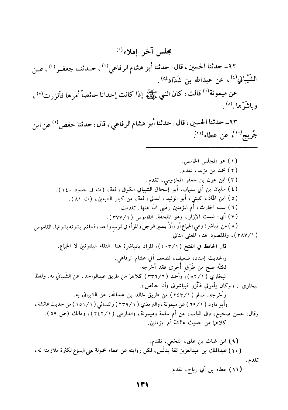 92 - حَدَّثَنَا الْحُسَيْنُ قَالَ حَدَّثَنَا أَبُو هِشَامٍ الرِّفَاعِيُّ، حَدَّثَنَا جَعْفَرٌ، عَنِ الشَّيْبَانِيِّ، عَنْ عَبْدِ اللَّهِ بْنِ شَدَّادٍ , عَنْ مَيْمُونَةَ قَالَتْ: «كَانَ النَّبِيُّ صَلَّى اللهُ عَلَيْهِ وَسَلَّمَ §إِذَا كَانَتْ إِحْدَانَا حَائِضًا أَمَرَهَا فَأْتَزَرَتْ وَبَاشَرَهَا»