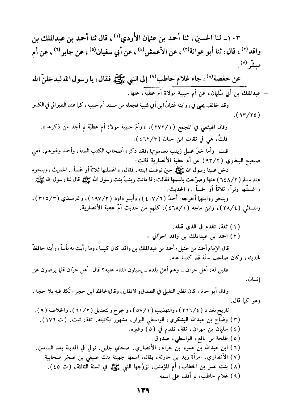 103 - حَدَّثَنَا الْحُسَيْنُ قَالَ ثنا أَحْمَدُ بْنُ عُثْمَانَ الْأَوْدِيُّ قَالَ: ثنا أَحْمَدُ بْنُ عَبْدِ الْمَلِكِ بْنِ وَاقِدٍ قَالَ: ثنا أَبُو عَوَانَةَ، عَنِ الْأَعْمَشِ، عَنْ أَبِي سُفْيَانَ، عَنْ جَابِرٍ، عَنْ أُمِّ مُبَشِّرٍ، عَنْ حَفْصَةَ جَاءَ غُلَامٌ حَاطِبٌ إِلَى النَّبِيِّ صَلَّى اللهُ عَلَيْهِ وَسَلَّمَ , فَقَالَ يَا رَسُولَ اللَّهِ: لَيُدْخِلَنَّ اللَّهُ -[140]- عَزَّ وَجَلَّ حَاطِبًا النَّارَ؟ قَالَ: «§كَذَبْتَ لَنْ يَلِجَ النَّارَ مَنْ شَهِدَ بَدْرًا وَالْحُدَيْبِيَةَ»