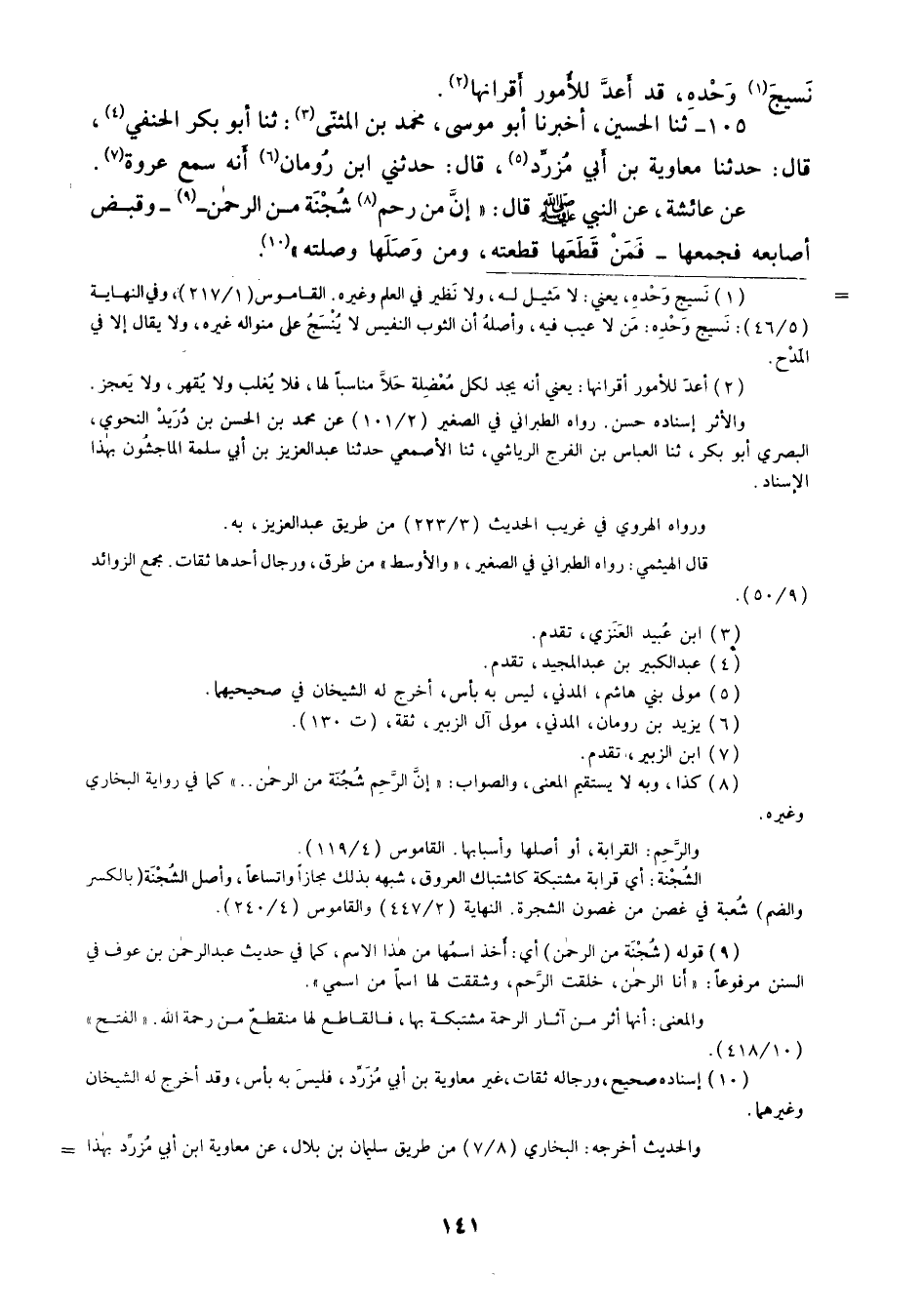 105 - ثَنَا الْحُسَيْنُ أَخْبَرَنَا أَبُو مُوسَى مُحَمَّدُ بْنُ الْمُثَنَّى , ثنا أَبُو بَكْرٍ الْحَنَفِيُّ قَالَ: حَدَّثَنَا مُعَاوِيَةُ بْنُ أَبِي مُزَرِّدٍ قَالَ: حَدَّثَنِي ابْنُ رُومَانَ، أَنَّهُ سَمِعَ عُرْوَةَ، عَنْ عَائِشَةَ عَنِ النَّبِيِّ صَلَّى اللهُ عَلَيْهِ وَسَلَّمَ قَالَ: «إِنَّ §الرَّحِمَ شُجْنَةٌ مِنَ الرَّحْمَنِ، وَقَبَضَ أَصَابِعَهُ فَجَمَعَهَا , فَمَنْ قَطَعَهَا قَطَعْتُهُ، وَمَنْ وَصَلَهَا وَصَلْتُهُ»