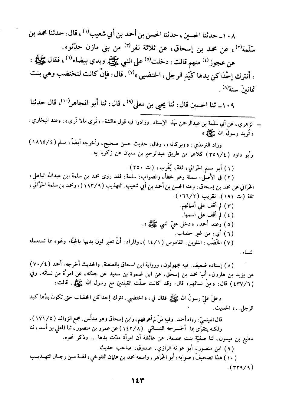 108 - حَدَّثَنَا الْحُسَيْنُ قَالَ حَدَّثَنَا الْحَسَنُ بْنُ أَحْمَدَ بْنِ أَبِي شُعَيْبٍ قَالَ: حَدَّثَنَا مُحَمَّدُ بْنُ سَلَمَةَ، عَنْ مُحَمَّدِ بْنِ إِسْحَاقَ، عَنْ ثَلَاثَةِ نَفَرٍ مِنْ بَنِي مَازِنٍ حَدَّثُوهُ , عَنْ عَجُوزٍ مِنْهُمْ قَالَتْ: دَخَلْتُ عَلَى النَّبِيِّ صَلَّى اللهُ عَلَيْهِ وَسَلَّمَ وَيَدِي بَيْضَاءُ , فَقَالَ صَلَّى اللهُ عَلَيْهِ وَسَلَّمَ: «§أَتَتْرُكُ إِحْدَاكُنَّ يَدَهَا كَيَدِ الرَّجُلِ , اخْتَضِبِي» قَالَ: فَإِنْ كَانَتْ لَتَخْتَضِبُ وَهِيَ بِنْتُ ثَمَانِينَ سَنَةً