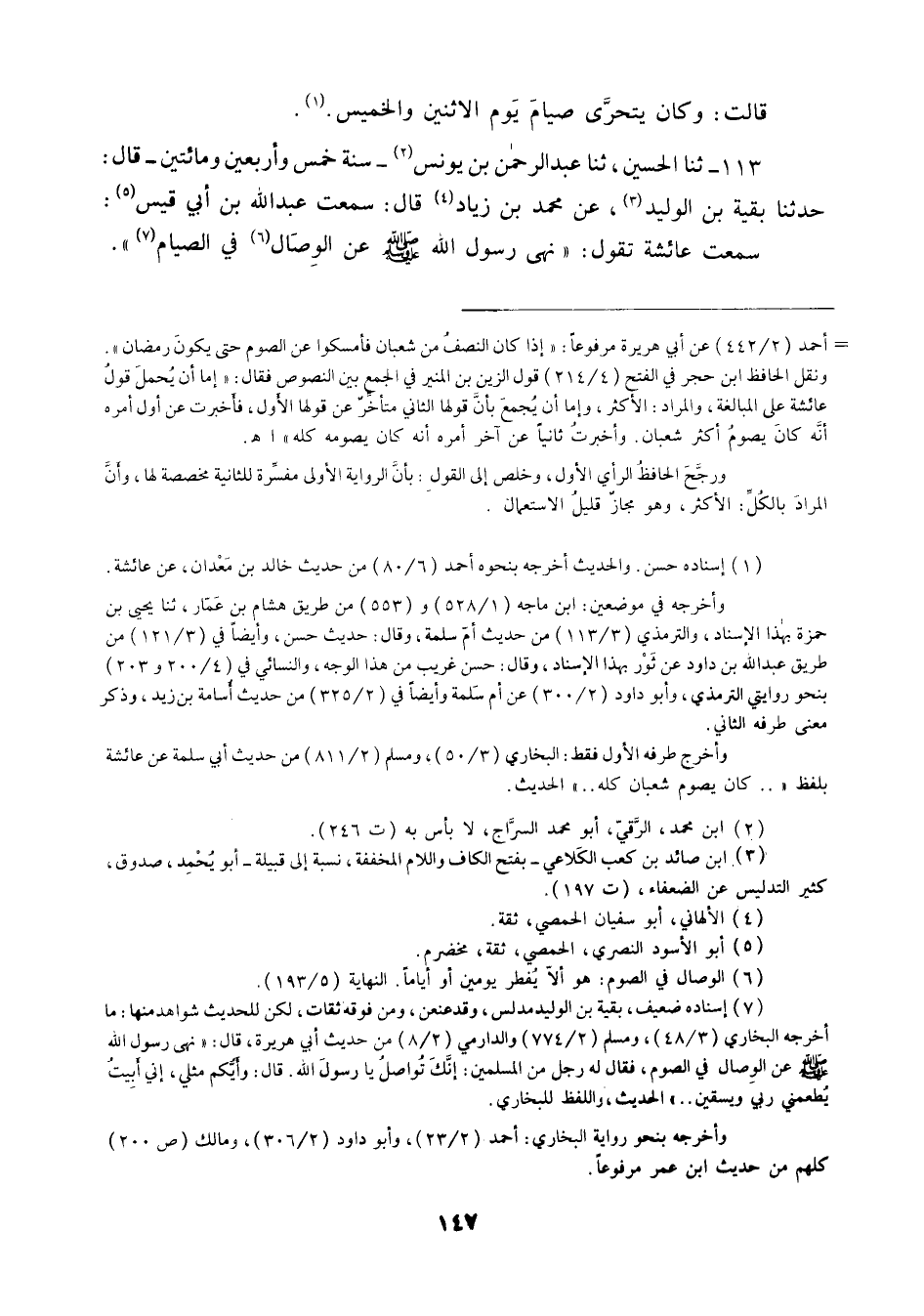 113 - ثنا الْحُسَيْنُ ثنا عَبْدُ الرَّحْمَنِ بْنُ يُونُسَ سَنَةَ خَمْسٍ وَأَرْبَعِينَ وَمِائَتَيْنِ قَالَ: حَدَّثَنَا بَقِيَّةُ بْنُ الْوَلِيدِ، عَنْ مُحَمَّدِ بْنِ زِيَادٍ قَالَ: سَمِعْتُ عَبْدَ اللَّهِ بْنَ أَبِي قَيْسٍ، سَمِعْتُ عَائِشَةَ تَقُولُ: «§نَهَى رَسُولُ اللَّهِ صَلَّى اللهُ عَلَيْهِ وَسَلَّمَ عَنِ الْوِصَالِ فِي الصِّيَامِ»